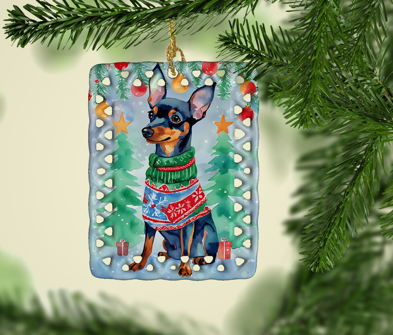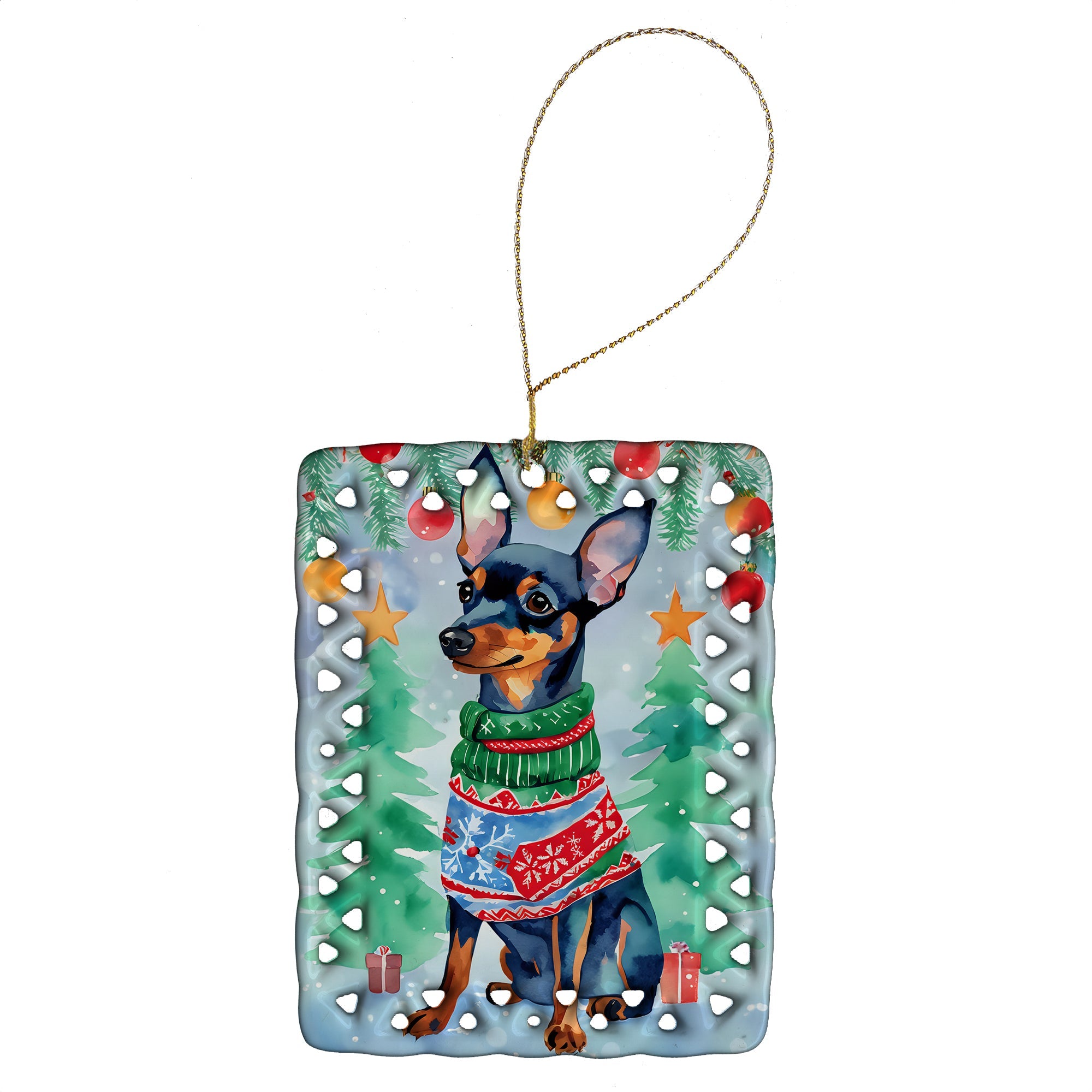 Porcelain Ornament featuring breed specific Miniature Pinscher artwork. Celebrate Christmas with this Christmas Ornament. Add a unique, personal touch to your holiday decor with our Rectangular Lattice Porcelain Ornament. Perfect for creating cherished memories, this high-quality ornament shines under festive lights, reflecting warmth and joy throughout your Christmas tree. Crafted with a glossy finish, it showcases vibrant, full-color artwork contributed by our talented artists, ensuring your tree is adorned with a burst of color and holiday spirit. What sets this Porcelain Ornament apart is its customizable white back. Use a paint pen or permanent marker to write a heartfelt message, commemorate a special year, or mark an unforgettable date, turning this ornament into a keepsake that will be treasured for years to come. For best results, allow any personalization to dry thoroughly before handling. Each ornament comes complete with a delicate gold cord, making it easy to hang and display. Proudly made in the USA, this ornament measures 3.375 x 2.625 inches and is a thoughtful gift for pet sitters, teachers, family members, or anyone who would appreciate a little extra holiday magic. Bring style, charm, and a touch of personal meaning to your Christmas tree with this beautifully designed ornament..