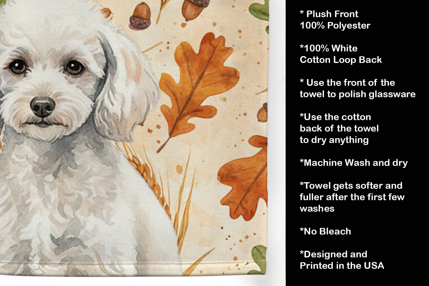 Kitchen Towel featuring breed specific Poodle artwork. Celebrate Thanksgiving with this Thanksgiving Kitchen Towel. Bring cozy fall charm to your sink or powder room with a plush velour towel featuring original watercolor artwork. The front is a soft, color-rich minky polyester that polishes glassware to a brilliant shine; the back is 100% white cotton terry loop for quick absorbency on hands, dishes, and counters. Artwork is dyed into the fibers for lasting color that won’t crack or peel. Finished edges keep the shape wash after wash. Size: 15" x 25". Machine wash; tumble dry low. Designed and printed in the USA.