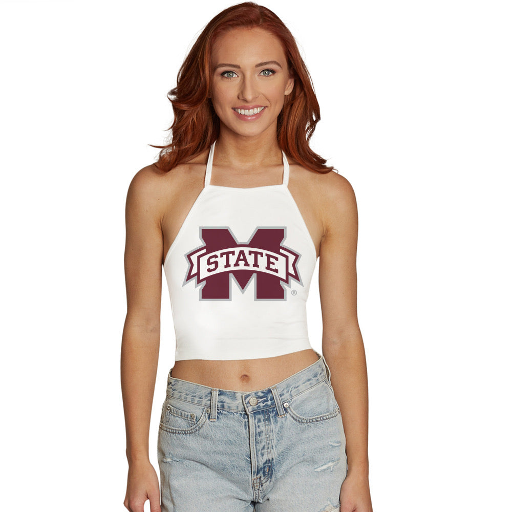 This super flattering Mississippi State White Halter Top is perfect for college game day. Our Mississippi State White Halter has the most comfortable cotton fabric. Lightweight and Comfortable.