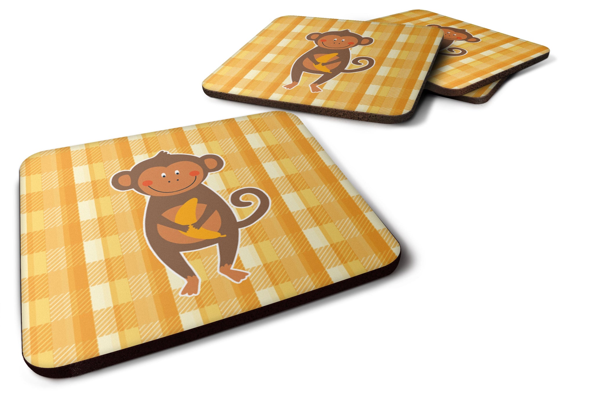 Decorate your space with our Monkey artwork on a Coaster set. Presenting our Set of 4 Foam Coasters, a stylish and practical addition to your table setting. Each square coaster, measuring 3 1/2 inches by 3 1/2 inches, is perfectly sized to accommodate various drinkware, from coffee mugs to tumblers. These coasters stand out with their full-color artwork, permanently dyed onto the material for a vibrant and fade-resistant finish. They're not just functional, they're a fashionable statement, adding a touch of flair to any gathering or event. Our foam coasters serve a dual purpose - they protect your table from water stains and are perfect for both hot and cold drinks. The material used is similar to that of our high-quality mouse pads, ensuring durability and heat resistance. These coasters are easy to maintain - simply wash them in the top of your dishwasher and lay flat to dry. The design won't come off, ensuring they retain their vivid colors for years. Pair them with one of our insulated coolers or huggers for a cohesive, thoughtful gift set. Enhance your beverage experience with our Set of 4 Foam Coasters.