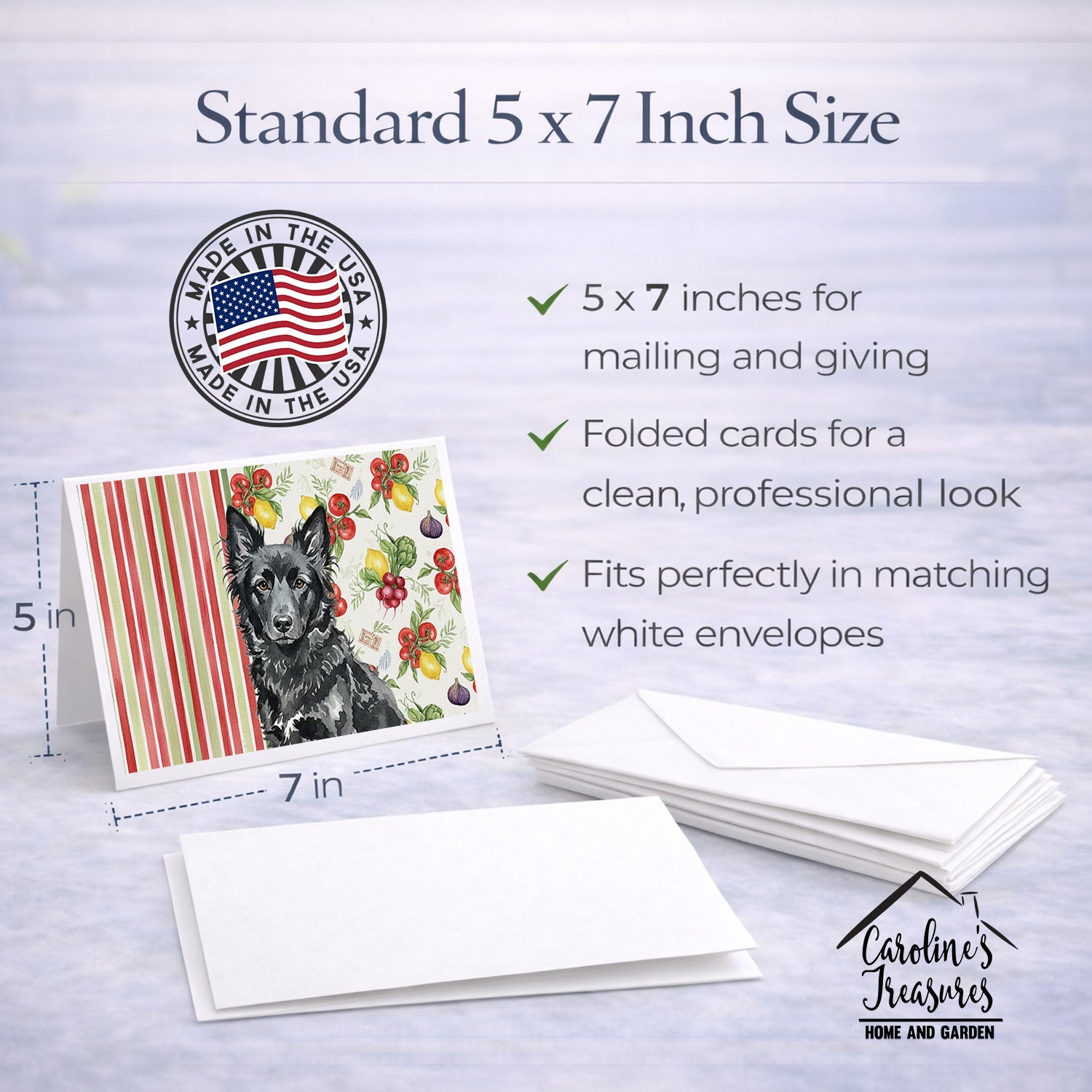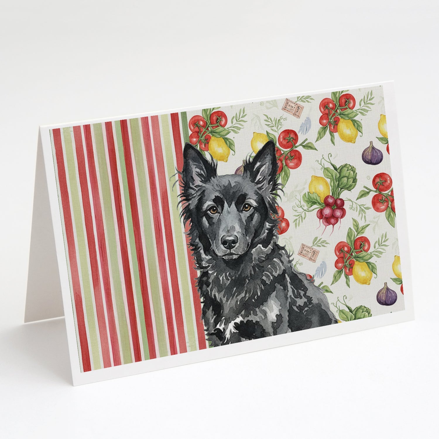 Shown here is the Mudi Vegetables Greeting Cards Pack of 8 from Caroline's Treasures featuring artwork of a Mudi in a Everyday design. The detailed illustration and vibrant colors make it a standout accent that celebrates both seasonal style and love for the subject. This image features a vibrant watercolor vegetable pattern with tomatoes, lemons, artichokes, figs, radishes, and leafy greens arranged in a repeating design, paired with classic red and green stripes. The bright, garden-fresh palette creates a cheerful, farmhouse-inspired look that feels lively, welcoming, and perfect for kitchen décor. Everyday décor celebrates personal style and the small moments that make a house feel like home. Thoughtful designs add warmth and personality that can be enjoyed year-round. Celebrate special moments with Caroline's Treasures Printed Greeting Card Pack. This pack includes eight beautifully folded 5x7 cards, accompanied by eight matching white envelopes. With blank interiors, these cards provide ample space for your personalized messages and heartfelt holiday greetings. Each card features captivating full-color artwork, meticulously printed in our facility on high-quality 80 lb cover stock or 216 GSM. The super smooth finish of the white cards enhances the visual impact of the artwork, creating a truly stunning presentation. Designed by our talented in-house artists or licensed artists, the artwork on these cards showcases their creativity and attention to detail. From vibrant illustrations to captivating designs, each card tells its own unique story. Whether it's for birthdays, anniversaries, holidays, or any special occasion, Caroline's Treasures Greeting Card Pack is the perfect way to convey your heartfelt sentiments. Share joy, love, and warm wishes with these exquisite cards and make every moment unforgettable. Perfect for: Writing personal messages, everyday correspondence, and thoughtful notes, Dogs-themed stationery collections, or year-round use for Mudi lovers. Mudi dogs are medium-sized with athletic builds and alert expressions. Their appearance reflects agility and intelligence. Makes a heartfelt gift for: Mudi owners, Dogs lovers, Everyday gifts, pet parents, friends who adore their Mudi, or anyone celebrating Dogs.