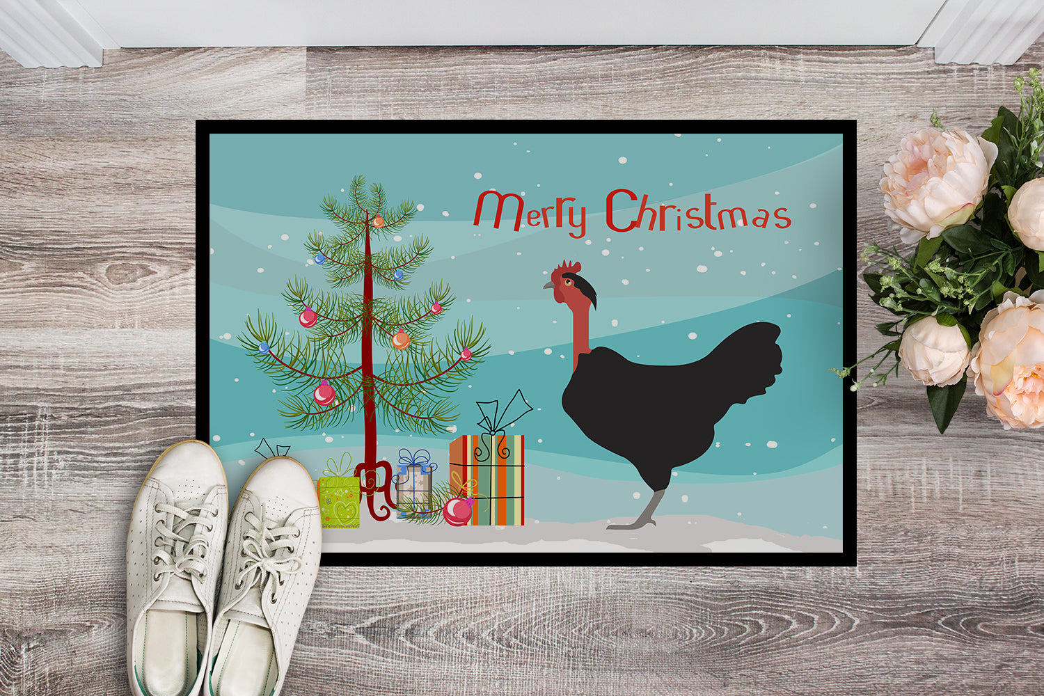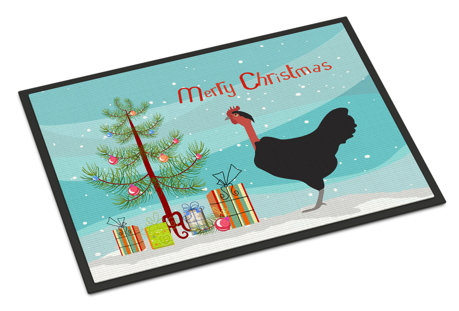 Decorate your space with our Christmas Naked Neck Chicken artwork on a Doormat. Welcome your guests in style with our Artwork Door Mat, designed to withstand almost any weather condition. This mat, measuring approximately 18 by 27 inches, is held together by durable black binding tape. Its top layer, composed of polyester felt, is dyed with the eye-catching image you see on the mat. A few layers below provide the mat with stability, while its rubber bottom is stamped to help prevent slipping and ensures safety. Our mat works wonderfully as both an indoor or outdoor door mat. For cleaning, simply hose it off with water or use a power washer - no need for any cleaner that produces suds. Avoid scrubbing with a brush, instead, opt for the vacuum on floor setting. Designed manufactured and printed in the USA, this mat is a perfect addition to your porch, outdoor kitchen, entryway, or any indoor space. Its unique design makes it a charming decorative rug that greets your guests and adds a stylish touch to your home decor.