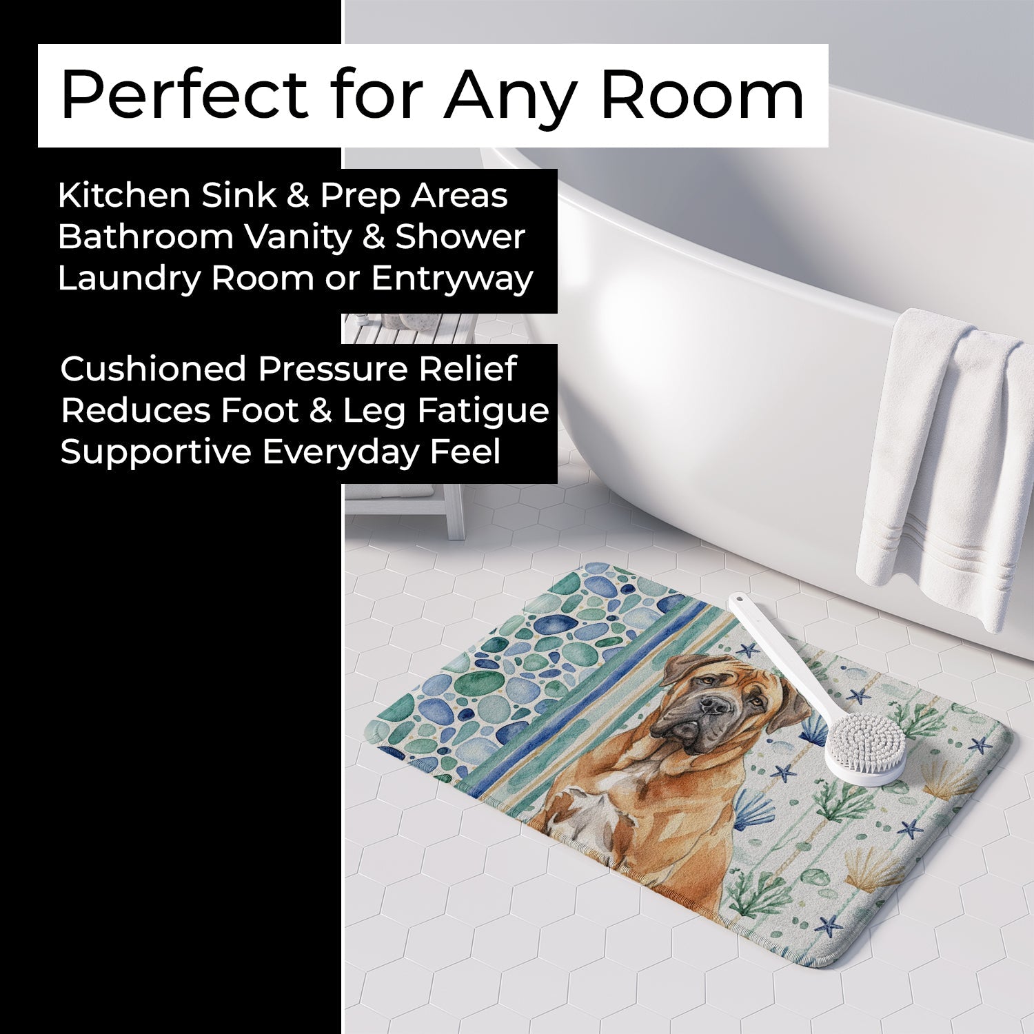 Shown here is the Neapolitan Mastiff Coastal Sea Glass Memory Foam Kitchen Mat from Caroline's Treasures featuring artwork of a Neapolitan Mastiff in a Everyday design. The detailed illustration and vibrant colors make it a standout accent that celebrates both seasonal style and love for the subject. This image features a calming coastal watercolor pattern with soft seashells, seaweed, starfish, and pebble-inspired accents arranged in a repeating design. The soothing palette of blues, greens, and sandy neutrals creates a relaxed, beach-inspired look that adds a fresh and tranquil feel to any space. Everyday décor celebrates personal style and the small moments that make a house feel like home. Thoughtful designs add warmth and personality that can be enjoyed year-round. Transform your floor into a work of art with Caroline's Treasures' Memory Foam Mat. This mat offers not only a stunning visual appeal but also a luxurious, plush feel that's incredibly comfortable to the touch. It's a versatile, machine-washable mat designed for both bath and kitchen use, ensuring you experience the best in comfort and convenience. Care Instructions: Maintaining this memory foam mat is a breeze. Simply follow the care instructions on the product tag. It's recommended to wash in cold water and dry on a low-temperature setting in the dryer. This ensures the mat retains its quality and longevity, allowing you to enjoy its beauty and comfort for a long time. Caroline's Treasures' Memory Foam Mat Machine Washable is the perfect blend of artistry, comfort, and practicality, making it a standout addition to any space. Upgrade your home decor with this versatile and stylish mat today. Neapolitan Mastiffs are massive guardian dogs known for their distinctive appearance and protective nature. This ancient breed is admired for its loyalty, calm demeanor, and strong family bonds. Makes a heartfelt gift for: Neapolitan Mastiff owners, Dogs lovers, Everyday gifts, pet parents, friends who adore their Neapolitan Mastiff, or anyone celebrating Dogs.