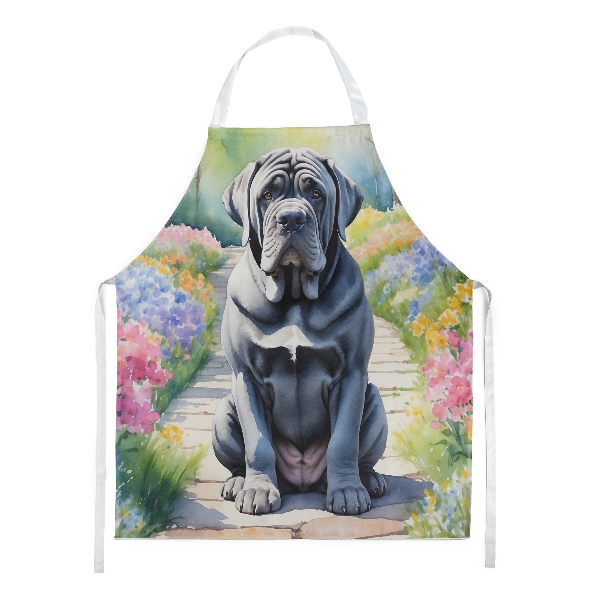 Decorate your space with our Neapolitan Mastiff artwork on a Apron. Bring a bit of Spring into your home with a Spring Apron. Elevate your cooking, baking, and grilling experiences with our versatile Kitchen or BBQ Apron. This Bib Style apron isn't just limited to culinary activities - it also serves as an excellent baking apron, artist apron, server apron, gardening apron, or even a dog grooming apron. The apron showcases vibrant full-color artwork contributed by one of our talented artists, bringing a dash of style to your daily tasks. With dimensions of approximately 27"W x 30"H, it provides ample coverage to protect your clothing from spills and splashes. Our apron is meticulously crafted from 100% Ultra Spun Polyester, known for its durability and lightweight nature. The apron comes with white tie straps, ensuring a comfortable and adjustable fit for all. It's a perfect choice for kitchen apron enthusiasts, whether you are a woman or a man. Designed for easy maintenance, this apron is fully machine washable. The quick-drying polyester material actively reduces staining, keeping your apron looking fresh and new for longer. Our beautifully designed apron isn't just a functional kitchen accessory - it's a fashion statement in the culinary world!