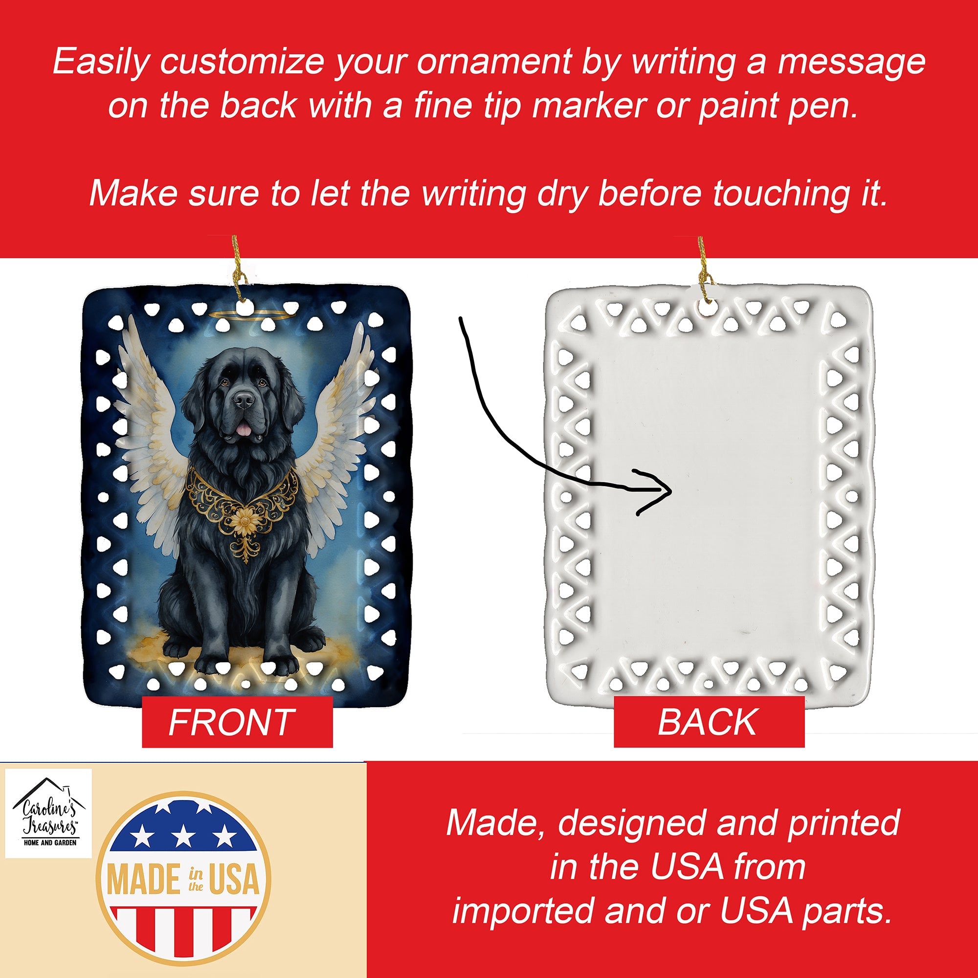 Porcelain Ornament featuring breed specific Newfoundland artwork. Celebrate Christmas with this Christmas Ornament. Add a unique, personal touch to your holiday decor with our Rectangular Lattice Porcelain Ornament. Perfect for creating cherished memories, this high-quality ornament shines under festive lights, reflecting warmth and joy throughout your Christmas tree. Crafted with a glossy finish, it showcases vibrant, full-color artwork contributed by our talented artists, ensuring your tree is adorned with a burst of color and holiday spirit. What sets this Porcelain Ornament apart is its customizable white back. Use a paint pen or permanent marker to write a heartfelt message, commemorate a special year, or mark an unforgettable date, turning this ornament into a keepsake that will be treasured for years to come. For best results, allow any personalization to dry thoroughly before handling. Each ornament comes complete with a delicate gold cord, making it easy to hang and display. Proudly made in the USA, this ornament measures 3.375 x 2.625 inches and is a thoughtful gift for pet sitters, teachers, family members, or anyone who would appreciate a little extra holiday magic. Bring style, charm, and a touch of personal meaning to your Christmas tree with this beautifully designed ornament..