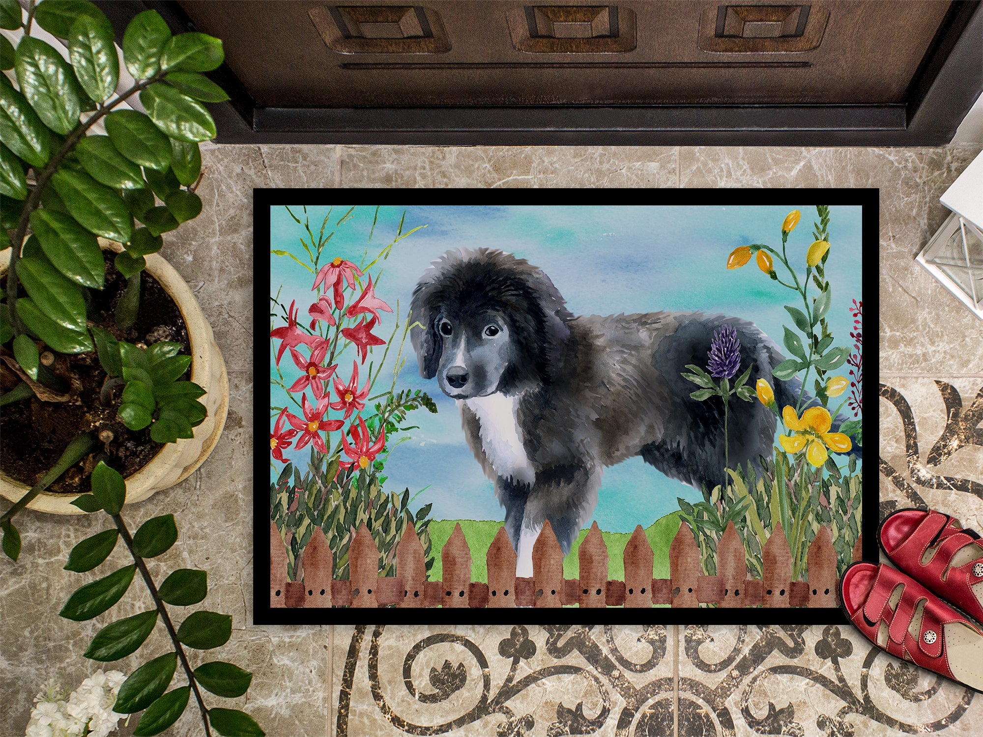 Decorate your space with our Newfoundland artwork on a Doormat. Bring a bit of Spring into your home with a Spring Doormat. Welcome your guests in style with our Artwork Door Mat, designed to withstand almost any weather condition. This mat, measuring approximately 18 by 27 inches, is held together by durable black binding tape. Its top layer, composed of polyester felt, is dyed with the eye-catching image you see on the mat. A few layers below provide the mat with stability, while its rubber bottom is stamped to help prevent slipping and ensures safety. Our mat works wonderfully as both an indoor or outdoor door mat. For cleaning, simply hose it off with water or use a power washer - no need for any cleaner that produces suds. Avoid scrubbing with a brush, instead, opt for the vacuum on floor setting. Designed manufactured and printed in the USA, this mat is a perfect addition to your porch, outdoor kitchen, entryway, or any indoor space. Its unique design makes it a charming decorative rug that greets your guests and adds a stylish touch to your home decor.