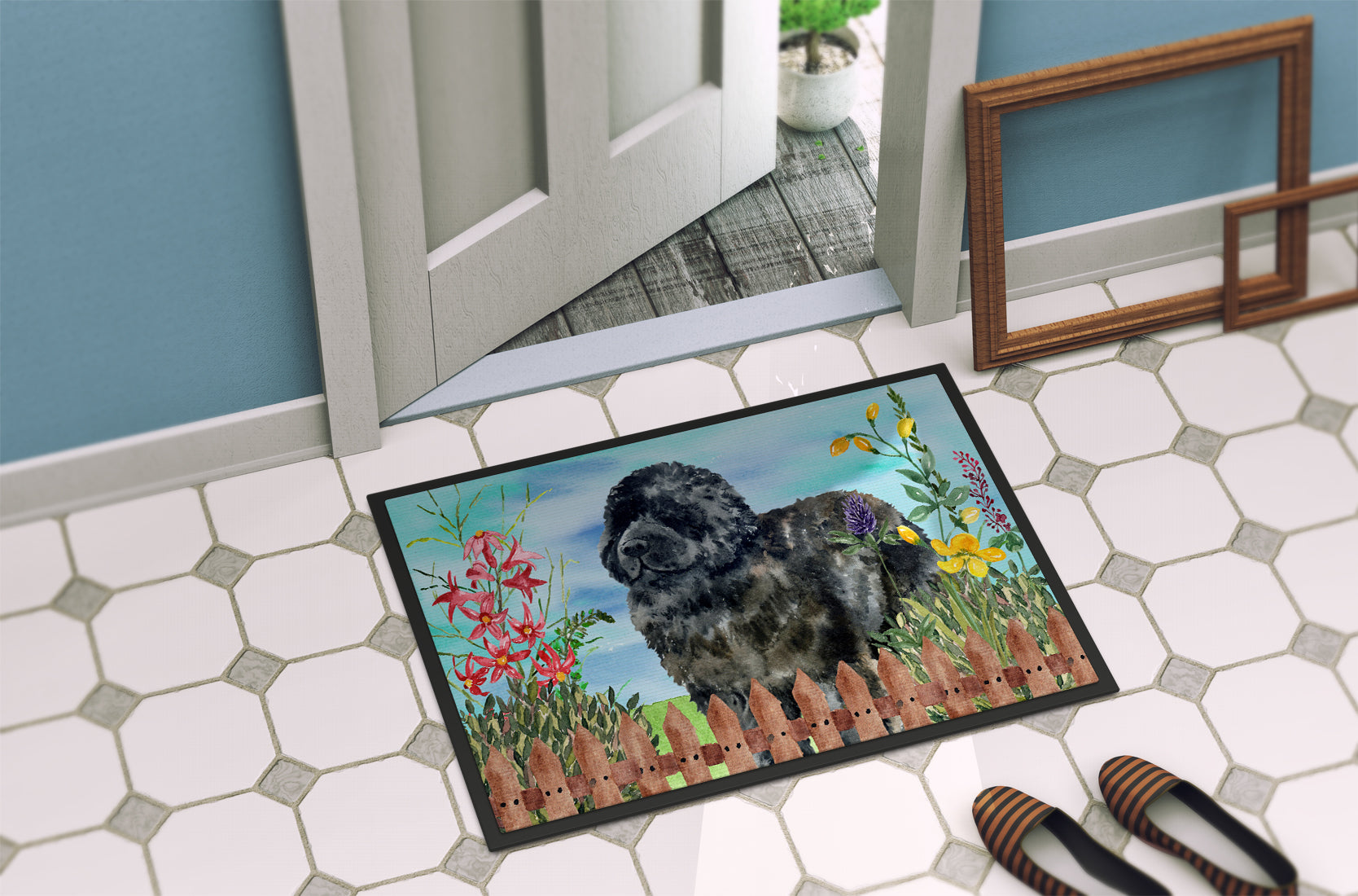 Decorate your space with our Newfoundland artwork on a Doormat. Bring a bit of Spring into your home with a Spring Doormat. Welcome your guests in style with our Artwork Door Mat, designed to withstand almost any weather condition. This mat, measuring approximately 24 by 36 inches, is held together by durable black binding tape. Its top layer, composed of polyester felt, is dyed with the eye-catching image you see on the mat. A few layers below provide the mat with stability, while its rubber bottom is stamped to help prevent slipping and ensures safety. Our mat works wonderfully as both an indoor or outdoor door mat. For cleaning, simply hose it off with water or use a power washer - no need for any cleaner that produces suds. Avoid scrubbing with a brush, instead, opt for the vacuum on floor setting. Designed manufactured and printed in the USA, this mat is a perfect addition to your porch, outdoor kitchen, entryway, or any indoor space. Its unique design makes it a charming decorative rug that greets your guests and adds a stylish touch to your home decor.