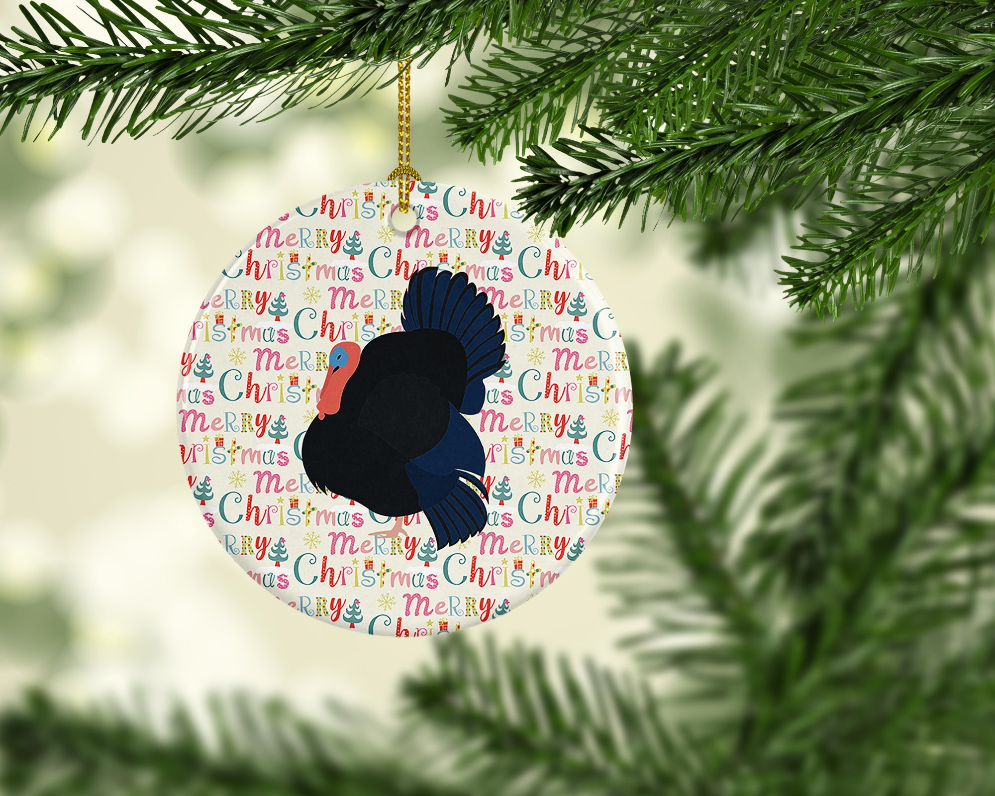 Decorate your space with our Christmas Norfolk Black Turkey artwork on a Ornament. Add a touch of personalized charm to your Christmas tree this holiday season with our Ceramic Ornament. Measuring 2.8125 inches in diameter, this round porcelain ornament beautifully reflects your festive lights, enhancing your holiday decor. The gloss surface sets off the vibrant, full-color artwork contributed by one of our talented artists, bringing a pop of color and joy to your tree. This Ceramic Ornament doesn't stop at being merely decorative. The white back is designed for personalization. Write a heartfelt message, mark a special year, or inscribe a date with a paint pen or a permanent marker to create a treasured memento. Please ensure you allow any personalization to dry thoroughly before handling to maintain the pristine finish. Included with the ornament is a delicate gold cord for easy hanging. Made in the USA, this Ceramic Ornament makes an exceptional gift for a pet sitter, teacher, family member, or anyone you wish to share a little Christmas magic with. With its blend of style, charm, and personal touch, it's a meaningful addition to any Christmas tree.
