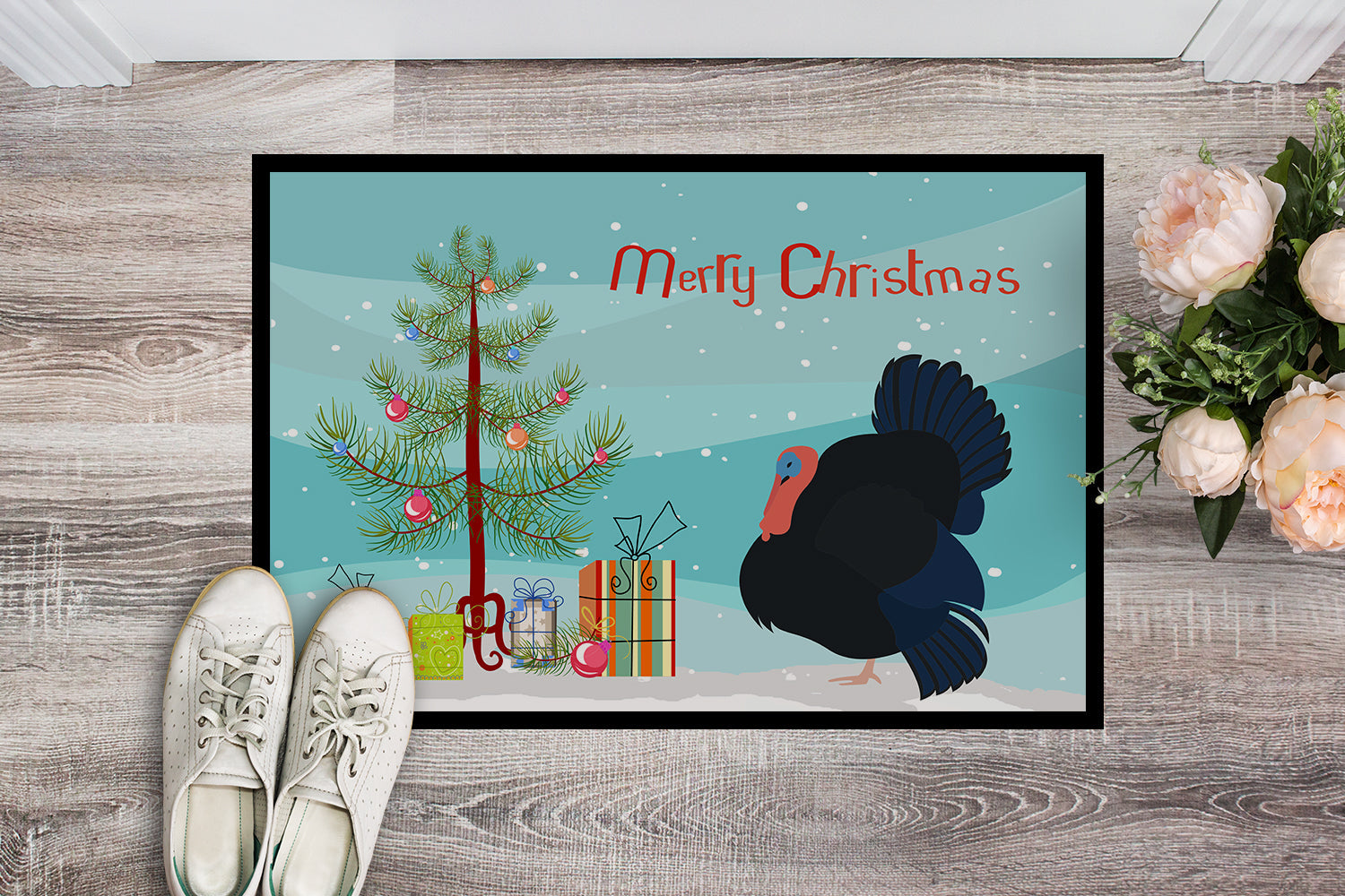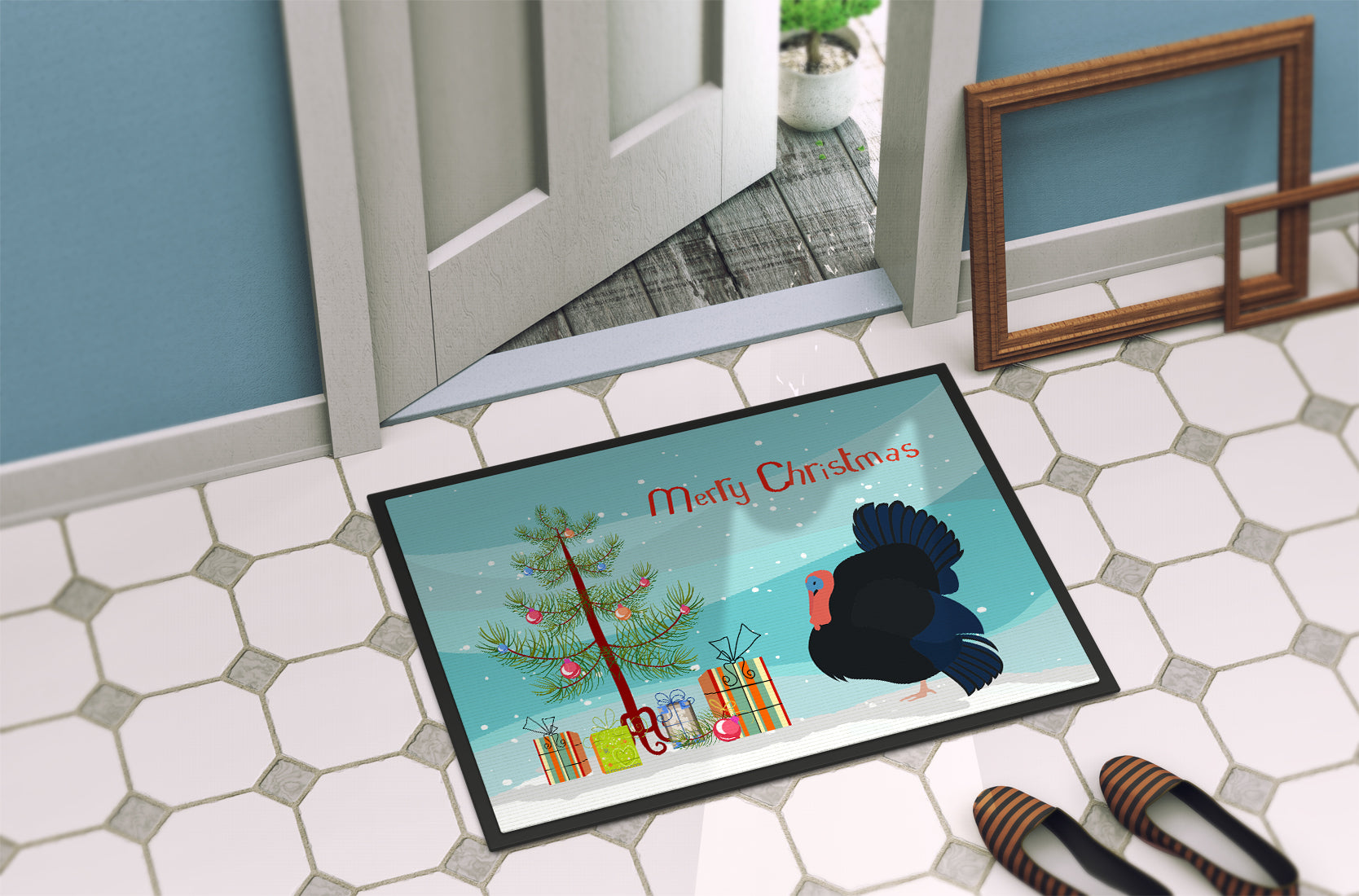 Decorate your space with our Christmas Norfolk Black Turkey artwork on a Doormat. Welcome your guests in style with our Artwork Door Mat, designed to withstand almost any weather condition. This mat, measuring approximately 18 by 27 inches, is held together by durable black binding tape. Its top layer, composed of polyester felt, is dyed with the eye-catching image you see on the mat. A few layers below provide the mat with stability, while its rubber bottom is stamped to help prevent slipping and ensures safety. Our mat works wonderfully as both an indoor or outdoor door mat. For cleaning, simply hose it off with water or use a power washer - no need for any cleaner that produces suds. Avoid scrubbing with a brush, instead, opt for the vacuum on floor setting. Designed manufactured and printed in the USA, this mat is a perfect addition to your porch, outdoor kitchen, entryway, or any indoor space. Its unique design makes it a charming decorative rug that greets your guests and adds a stylish touch to your home decor.
