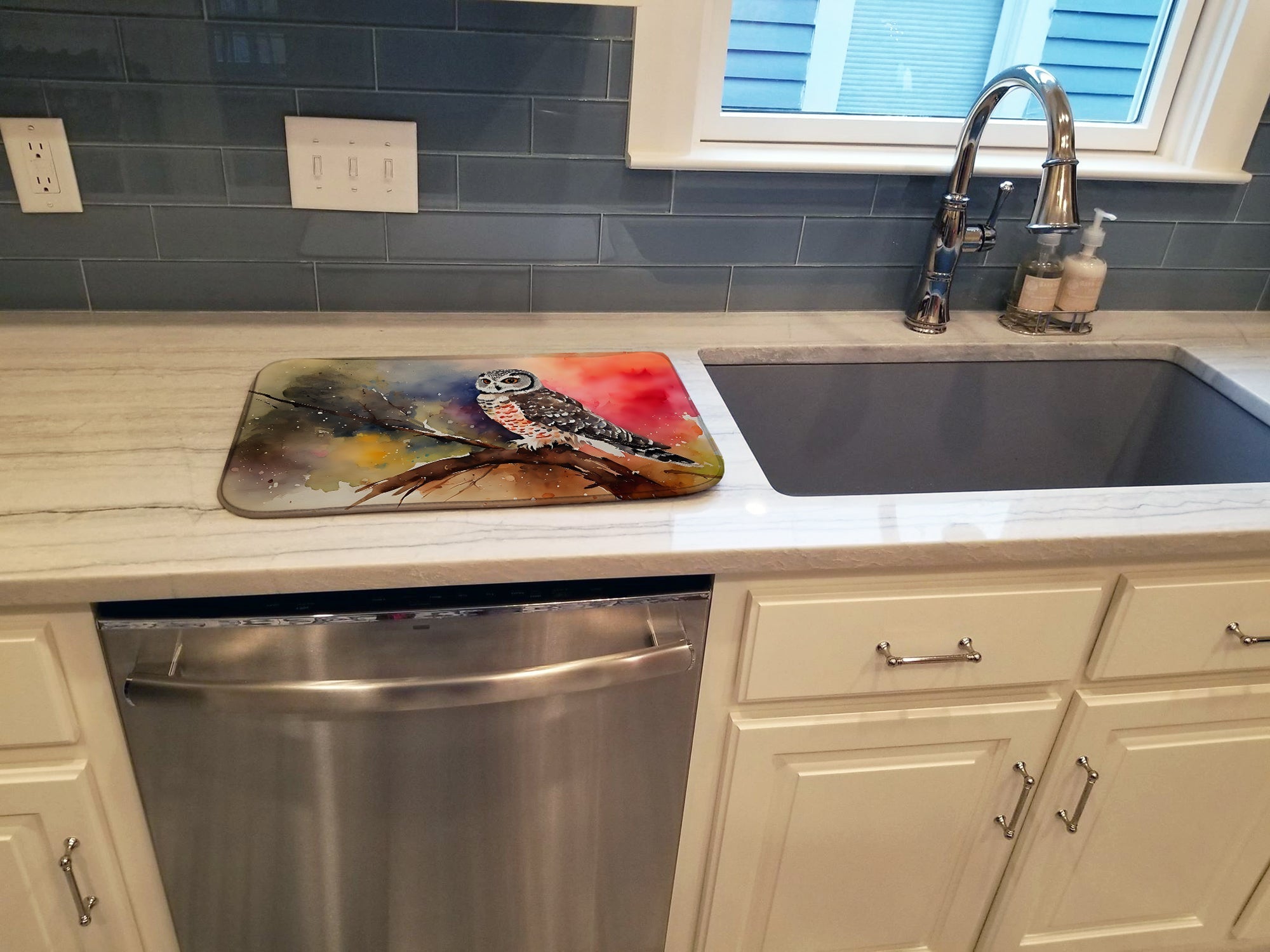 Dish Drying Mat featuring breed specific Northern Hawk Owl artwork. Say goodbye to messy countertops and soggy dish towels with our innovative dish drying mat. Our high-quality dish drying pad is designed to keep your countertops dry while offering a stylish and efficient solution. Whether you're air drying dishes, glasses, stemware, silverware, pots, pans, bottles, or even fruits and vegetables, our dish mat is the perfect choice. The 14 inches x 22 inches size fits most counters and dish drying racks, and the non-slip design ensures stability. Made with water-absorbent polyester and a polyurethane foam insert, our dish drying mat is not only functional but also durable. It's machine washable and printed in the USA for long-lasting use. The beautiful artwork adds flair to your kitchen decor, making it a perfect housewarming gift or present for any occasion. Upgrade your kitchen experience with our absorbent and versatile dish drying mat.