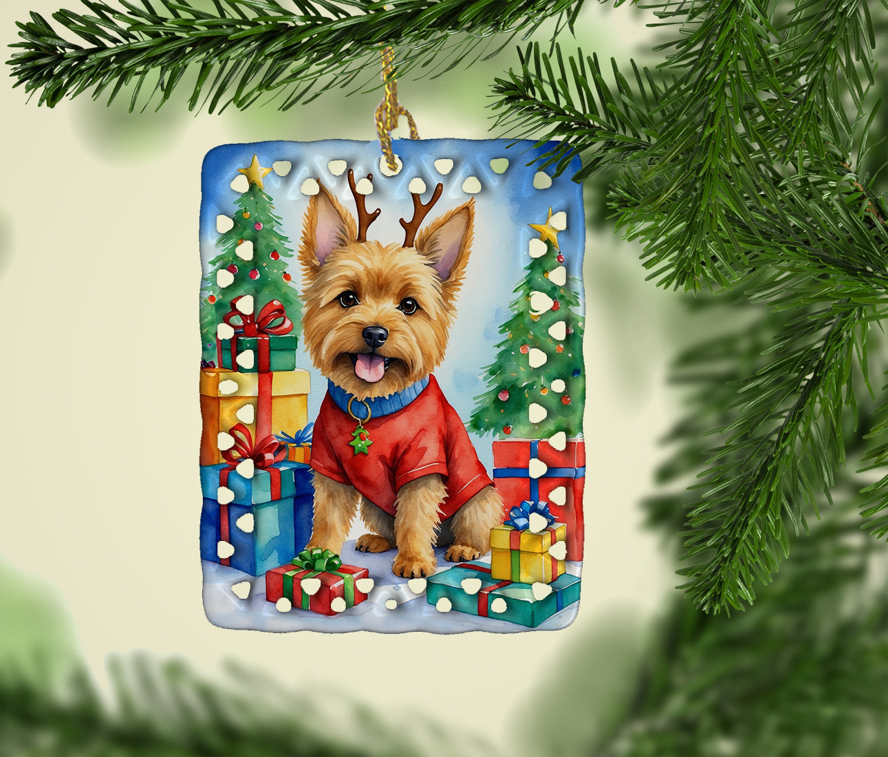 Porcelain Ornament featuring breed specific Norwich Terrier artwork. Celebrate Christmas with this Christmas Ornament. Add a unique, personal touch to your holiday decor with our Rectangular Lattice Porcelain Ornament. Perfect for creating cherished memories, this high-quality ornament shines under festive lights, reflecting warmth and joy throughout your Christmas tree. Crafted with a glossy finish, it showcases vibrant, full-color artwork contributed by our talented artists, ensuring your tree is adorned with a burst of color and holiday spirit. What sets this Porcelain Ornament apart is its customizable white back. Use a paint pen or permanent marker to write a heartfelt message, commemorate a special year, or mark an unforgettable date, turning this ornament into a keepsake that will be treasured for years to come. For best results, allow any personalization to dry thoroughly before handling. Each ornament comes complete with a delicate gold cord, making it easy to hang and display. Proudly made in the USA, this ornament measures 3.375 x 2.625 inches and is a thoughtful gift for pet sitters, teachers, family members, or anyone who would appreciate a little extra holiday magic. Bring style, charm, and a touch of personal meaning to your Christmas tree with this beautifully designed ornament..