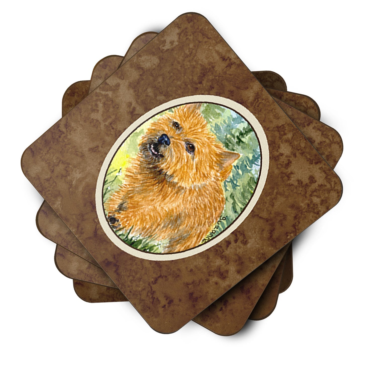 Decorate your space with our Norwich Terrier artwork on a Coaster set. Presenting our Set of 4 Foam Coasters, a stylish and practical addition to your table setting. Each square coaster, measuring 3 1/2 inches by 3 1/2 inches, is perfectly sized to accommodate various drinkware, from coffee mugs to tumblers. These coasters stand out with their full-color artwork, permanently dyed onto the material for a vibrant and fade-resistant finish. They're not just functional, they're a fashionable statement, adding a touch of flair to any gathering or event. Our foam coasters serve a dual purpose - they protect your table from water stains and are perfect for both hot and cold drinks. The material used is similar to that of our high-quality mouse pads, ensuring durability and heat resistance. These coasters are easy to maintain - simply wash them in the top of your dishwasher and lay flat to dry. The design won't come off, ensuring they retain their vivid colors for years. Pair them with one of our insulated coolers or huggers for a cohesive, thoughtful gift set. Enhance your beverage experience with our Set of 4 Foam Coasters.