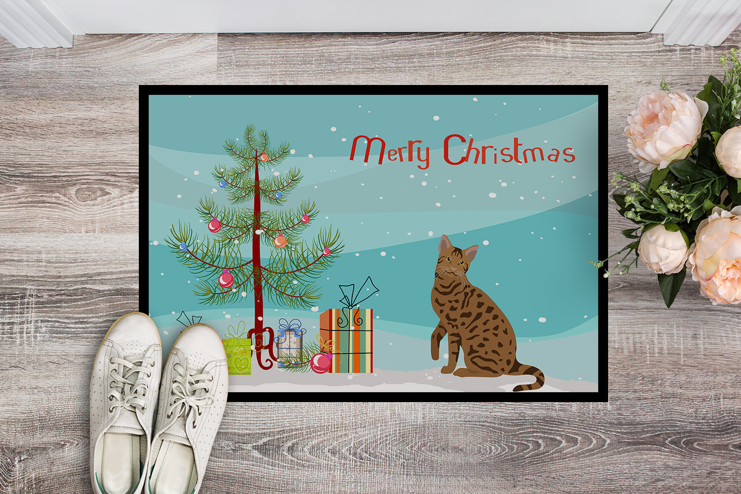 Decorate your space with our Christmas Ocicat artwork on a Doormat. Welcome your guests in style with our Artwork Door Mat, designed to withstand almost any weather condition. This mat, measuring approximately 24 by 36 inches, is held together by durable black binding tape. Its top layer, composed of polyester felt, is dyed with the eye-catching image you see on the mat. A few layers below provide the mat with stability, while its rubber bottom is stamped to help prevent slipping and ensures safety. Our mat works wonderfully as both an indoor or outdoor door mat. For cleaning, simply hose it off with water or use a power washer - no need for any cleaner that produces suds. Avoid scrubbing with a brush, instead, opt for the vacuum on floor setting. Designed manufactured and printed in the USA, this mat is a perfect addition to your porch, outdoor kitchen, entryway, or any indoor space. Its unique design makes it a charming decorative rug that greets your guests and adds a stylish touch to your home decor.