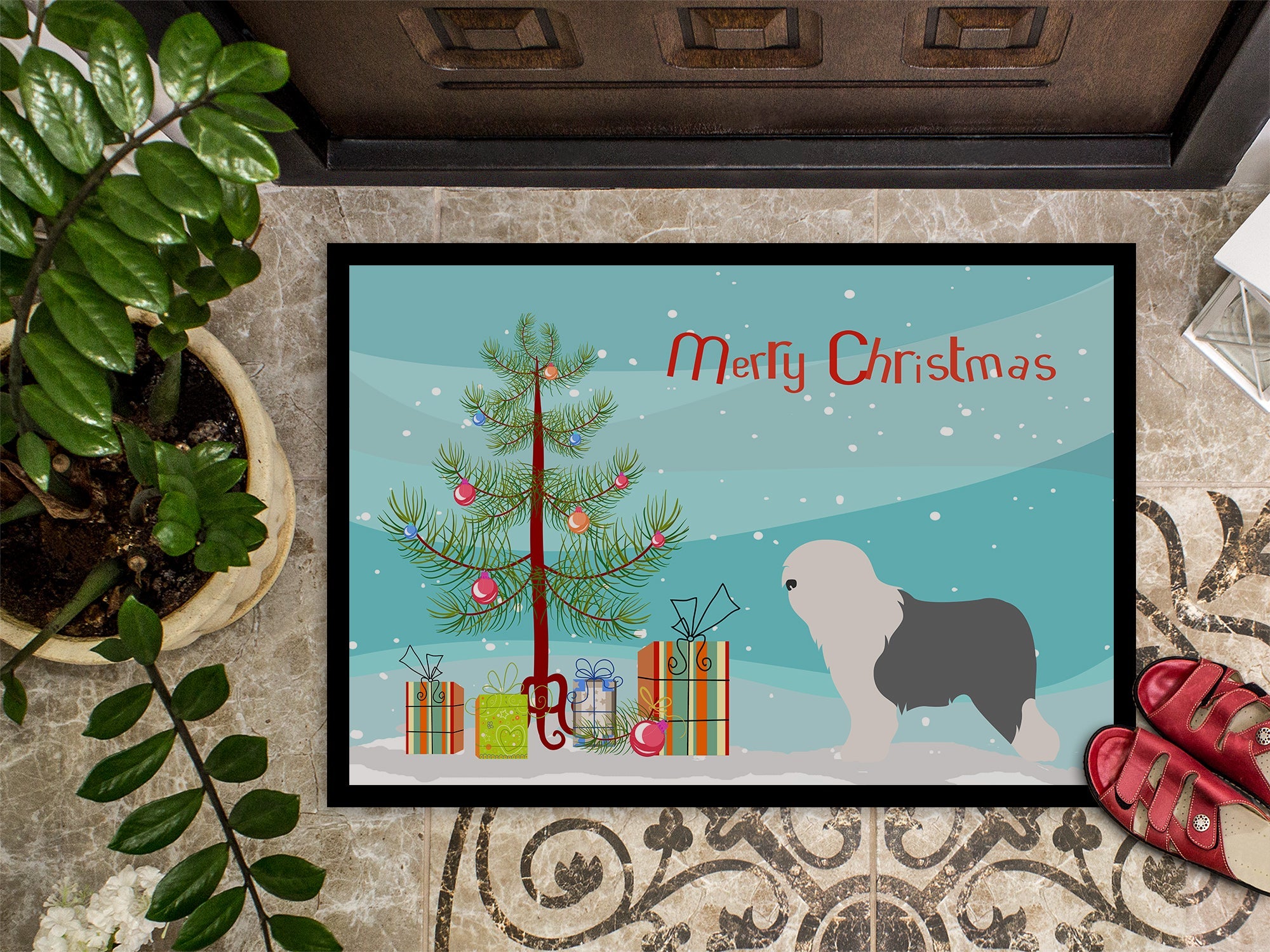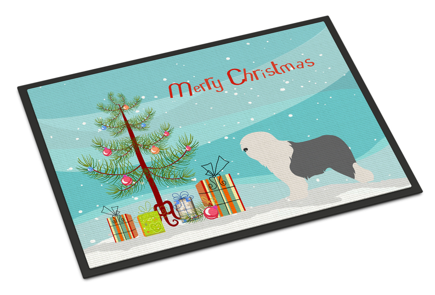 Decorate your space with our Christmas Old English Sheepdog artwork on a Doormat. Welcome your guests in style with our Artwork Door Mat, designed to withstand almost any weather condition. This mat, measuring approximately 18 by 27 inches, is held together by durable black binding tape. Its top layer, composed of polyester felt, is dyed with the eye-catching image you see on the mat. A few layers below provide the mat with stability, while its rubber bottom is stamped to help prevent slipping and ensures safety. Our mat works wonderfully as both an indoor or outdoor door mat. For cleaning, simply hose it off with water or use a power washer - no need for any cleaner that produces suds. Avoid scrubbing with a brush, instead, opt for the vacuum on floor setting. Designed manufactured and printed in the USA, this mat is a perfect addition to your porch, outdoor kitchen, entryway, or any indoor space. Its unique design makes it a charming decorative rug that greets your guests and adds a stylish touch to your home decor.