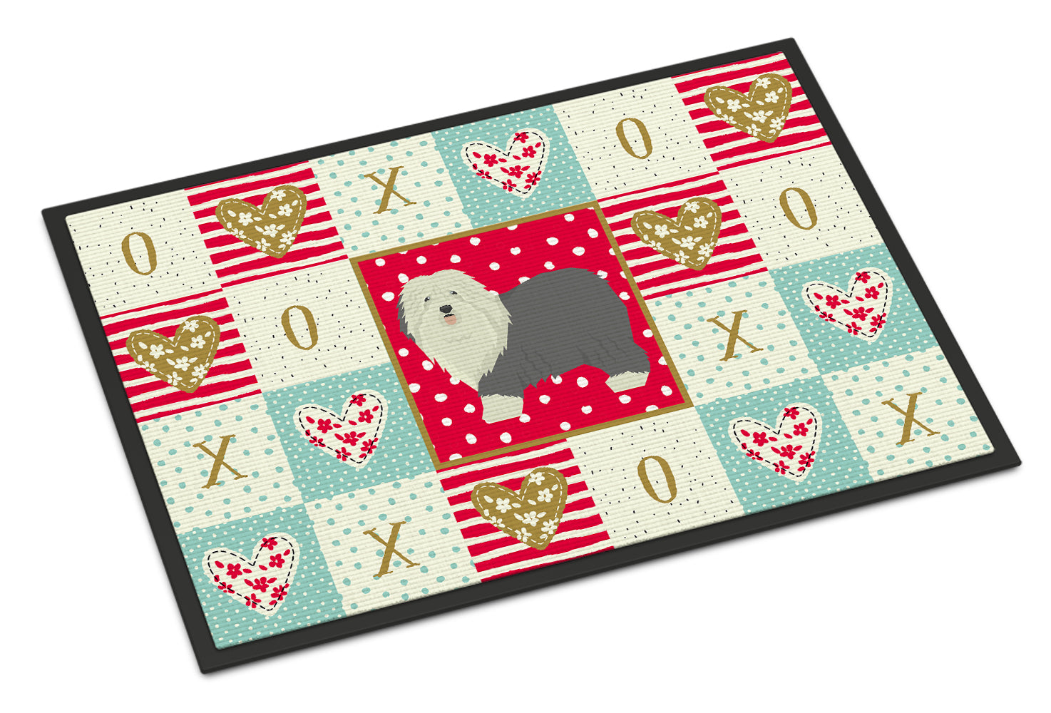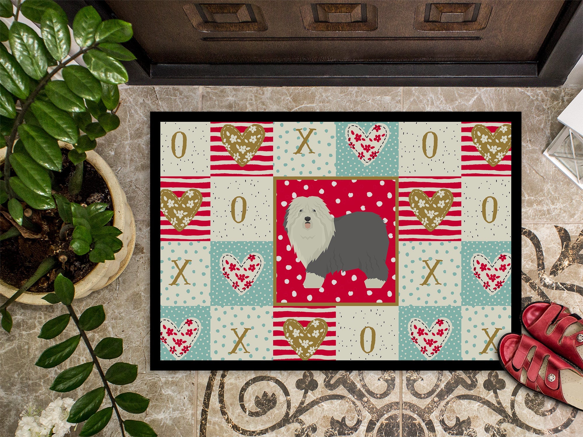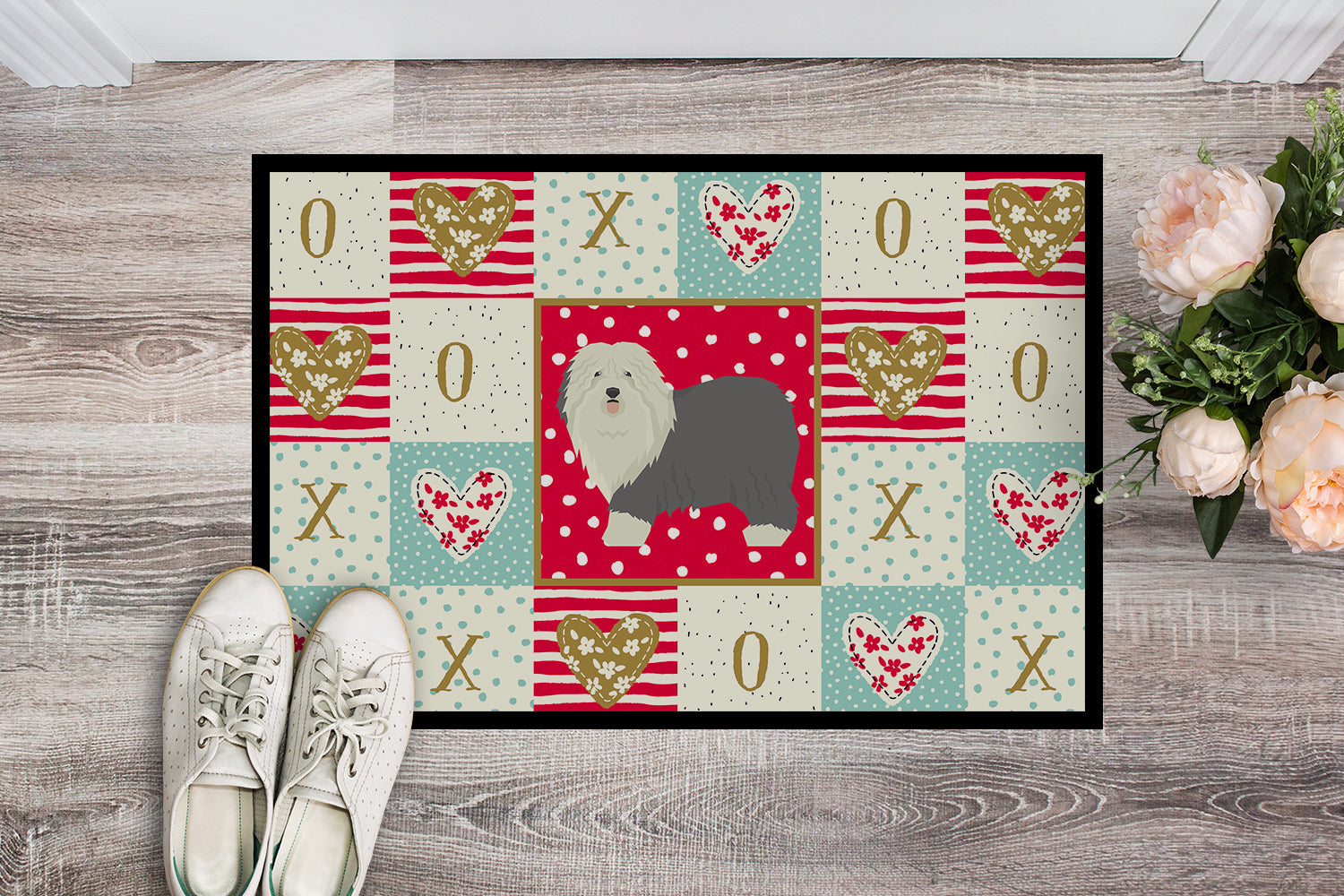 Decorate your space with our Valentine's Day Old English Sheepdog artwork on a Doormat. Welcome your guests in style with our Artwork Door Mat, designed to withstand almost any weather condition. This mat, measuring approximately 24 by 36 inches, is held together by durable black binding tape. Its top layer, composed of polyester felt, is dyed with the eye-catching image you see on the mat. A few layers below provide the mat with stability, while its rubber bottom is stamped to help prevent slipping and ensures safety. Our mat works wonderfully as both an indoor or outdoor door mat. For cleaning, simply hose it off with water or use a power washer - no need for any cleaner that produces suds. Avoid scrubbing with a brush, instead, opt for the vacuum on floor setting. Designed manufactured and printed in the USA, this mat is a perfect addition to your porch, outdoor kitchen, entryway, or any indoor space. Its unique design makes it a charming decorative rug that greets your guests and adds a stylish touch to your home decor.