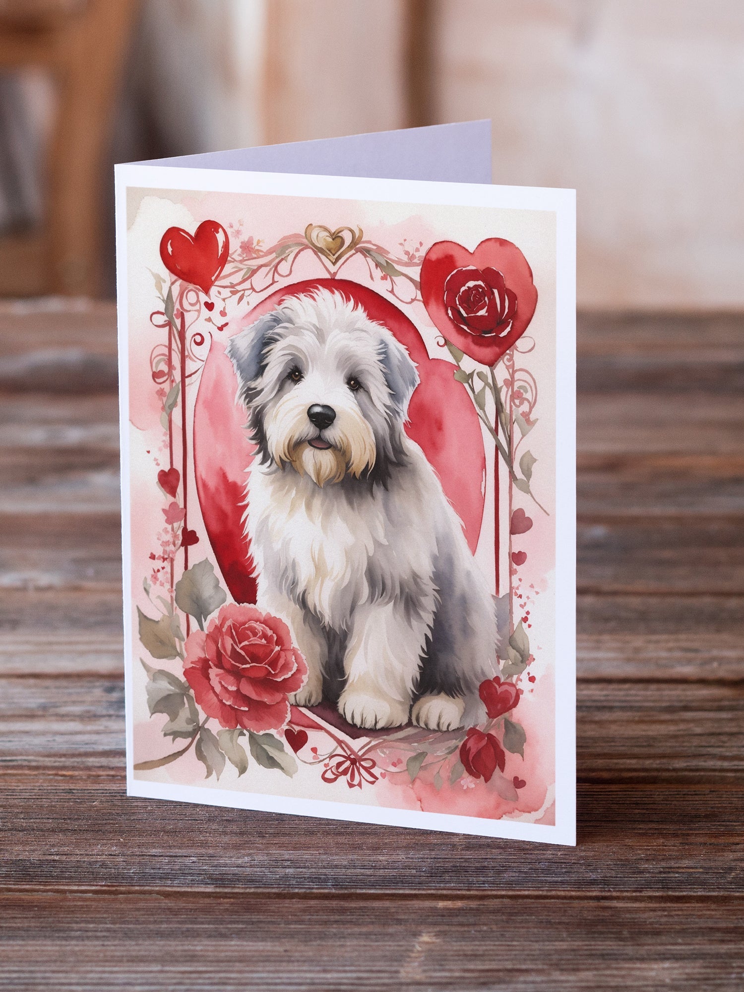 Decorate your space with our Valentine's Day Old English Sheepdog artwork on a . Celebrate special moments with Caroline's Treasures Printed Greeting Card Pack. This pack includes eight beautifully folded 5x7 cards, accompanied by eight matching white envelopes. With blank interiors, these cards provide ample space for your personalized messages and heartfelt holiday greetings. Each card features captivating full-color artwork, meticulously printed in our facility on high-quality 80 lb cover stock or 216 GSM. The super smooth finish of the white cards enhances the visual impact of the artwork, creating a truly stunning presentation. Designed by our talented in-house artists or licensed artists, the artwork on these cards showcases their creativity and attention to detail. From vibrant illustrations to captivating designs, each card tells its own unique story. Whether it's for birthdays, anniversaries, holidays, or any special occasion, Caroline's Treasures Greeting Card Pack is the perfect way to convey your heartfelt sentiments. Share joy, love, and warm wishes with these exquisite cards and make every moment unforgettable.