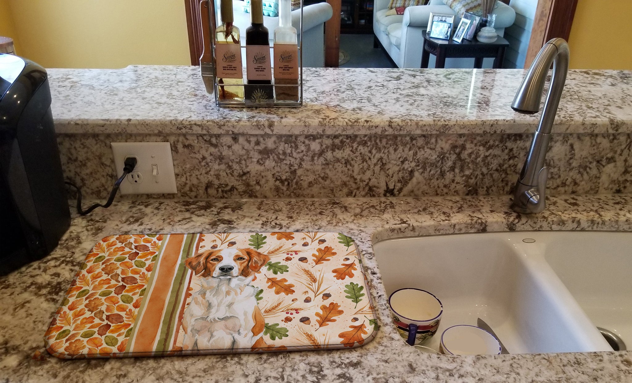 Dish Drying Mat featuring breed specific Brittany artwork. Celebrate Thanksgiving with this Thanksgiving Dish Drying Mat. Say goodbye to messy countertops and soggy dish towels with our innovative dish drying mat. Our high-quality dish drying pad is designed to keep your countertops dry while offering a stylish and efficient solution. Whether you're air drying dishes, glasses, stemware, silverware, pots, pans, bottles, or even fruits and vegetables, our dish mat is the perfect choice. The 14 inches x 22 inches size fits most counters and dish drying racks, and the non-slip design ensures stability. Made with water-absorbent polyester and a polyurethane foam insert, our dish drying mat is not only functional but also durable. It's machine washable and printed in the USA for long-lasting use. The beautiful artwork adds flair to your kitchen decor, making it a perfect housewarming gift or present for any occasion. Upgrade your kitchen experience with our absorbent and versatile dish drying mat.
