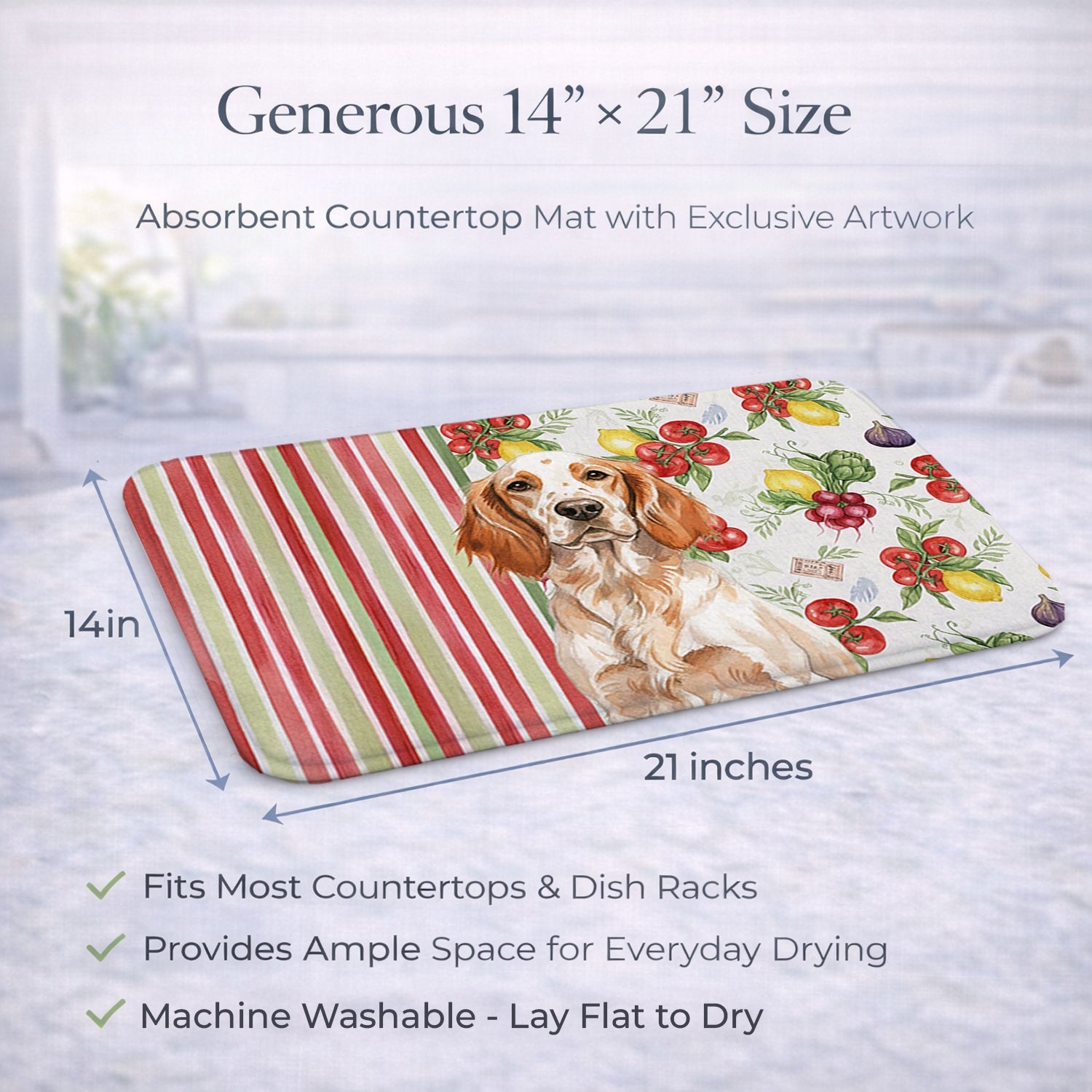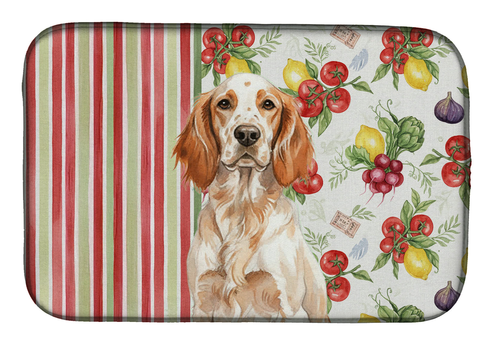 Shown here is the Orange Belton English Setter Vegetables Dish Drying Mat from Caroline's Treasures featuring artwork of a English Setter in a Everyday design. The detailed illustration and vibrant colors make it a standout accent that celebrates both seasonal style and love for the subject. This image features a vibrant watercolor vegetable pattern with tomatoes, lemons, artichokes, figs, radishes, and leafy greens arranged in a repeating design, paired with classic red and green stripes. The bright, garden-fresh palette creates a cheerful, farmhouse-inspired look that feels lively, welcoming, and perfect for kitchen décor. Everyday décor celebrates personal style and the small moments that make a house feel like home. Thoughtful designs add warmth and personality that can be enjoyed year-round. Say goodbye to messy countertops and soggy dish towels with our innovative dish drying mat. Our high-quality dish drying pad is designed to keep your countertops dry while offering a stylish and efficient solution. Whether you're air drying dishes, glasses, stemware, silverware, pots, pans, bottles, or even fruits and vegetables, our dish mat is the perfect choice. The 14 inches x 21 inches size fits most counters and dish drying racks, and the non-slip design ensures stability. Made with water-absorbent polyester and a polyurethane foam insert, our dish drying mat is not only functional but also durable. It's machine washable and printed in the USA for long-lasting use. The beautiful artwork adds flair to your kitchen decor, making it a perfect housewarming gift or present for any occasion. Upgrade your kitchen experience with our absorbent and versatile dish drying mat. Perfect for: Kitchen counters and sinks, everyday dish drying and countertop protection, Dogs-themed homes, or year-round use for English Setter lovers. English Setters are elegant sporting dogs known for their graceful movement and friendly temperament. This breed is valued for its intelligence, endurance, and affectionate nature. Makes a heartfelt gift for: English Setter owners, Dogs lovers, Everyday gifts, pet parents, friends who adore their English Setter, or anyone celebrating Dogs.