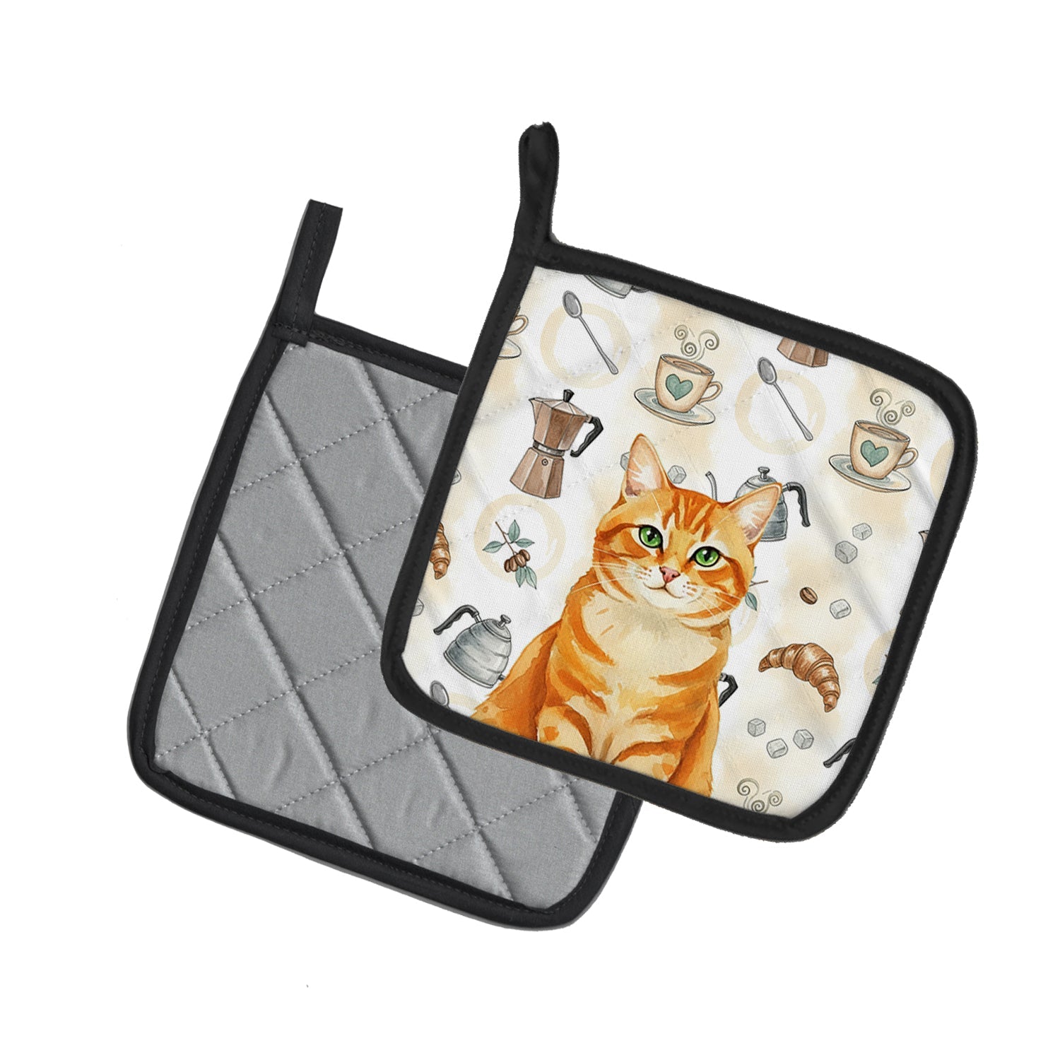 Pair of Pot Holders featuring breed specific Orange Classic Tabby artwork. Celebrate Christmas with this Christmas Pair of Pot Holders. Add warmth, personality, and function to your kitchen with our Vegetables Pot Holder Pair. Each set includes two quilted hot pads, featuring original full-color watercolor artwork on a soft polyester front accented by black trim. Crafted with multiple layers for performance: Top Layer: Vibrant artwork permanently dyed into polyester fabric. Middle Layer: US-manufactured insulated material with breathable polyester fibers and a reflective metalized film that reflects heat back to its source. Bottom Layer: A silver heat-resistant backing for extra protection. Each pot holder measures 7.5" x 7.5", includes a hanging tab, and is quilted for durability. Use them to protect your hands, countertops, and tabletops — or as decorative trivets for Thanksgiving, Christmas, or everyday meals.