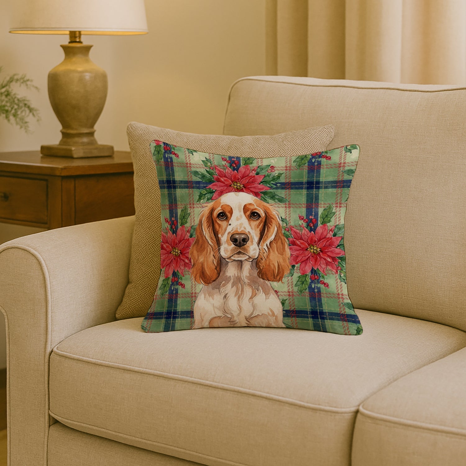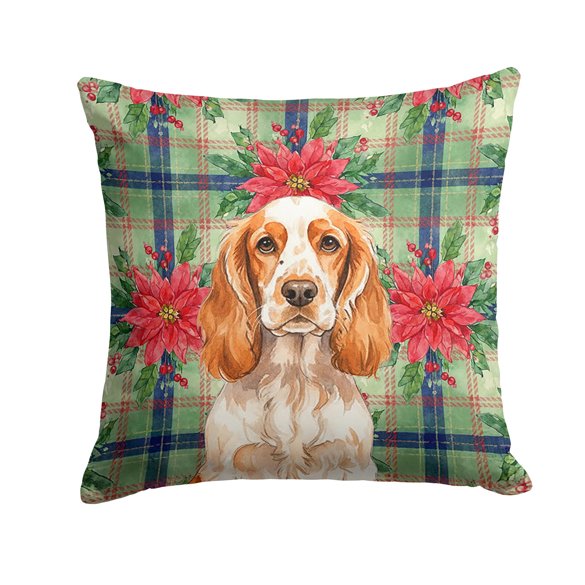 Throw Pillow featuring breed specific English Cocker Spaniel artwork. Celebrate Christmas with this Christmas Pillow. Revitalize your outdoor or indoor living space with Caroline's Treasures 18x18 Fabric Decorative Pillow. With a generously sized dimension of approximately 18 inches by 18 inches, this pillow makes a comfortable and aesthetic addition to any seating area. Made from a unique, water-resistant material developed by Caroline's Treasures, the pillow sham is 100% polyester fabric that's durable and ready to weather any condition. Its vibrant, full-color artwork will not fade over time as it is dyed with color-fast dyes. Whether you place it on your patio furniture, porch, veranda, or indoor couch, its soft canvas fabric ensures a cozy experience. The pillow is handcrafted in the United States, featuring a sham created from three pieces of fabric and a polyester insert for enduring shape and overstuffed comfort. Despite being robustly built to endure the outdoors, it is as soft and snug as your favorite indoor cushions. Please note, as all our pillows are handmade, sizes may vary slightly, adding to the charm of this unique decorative item.