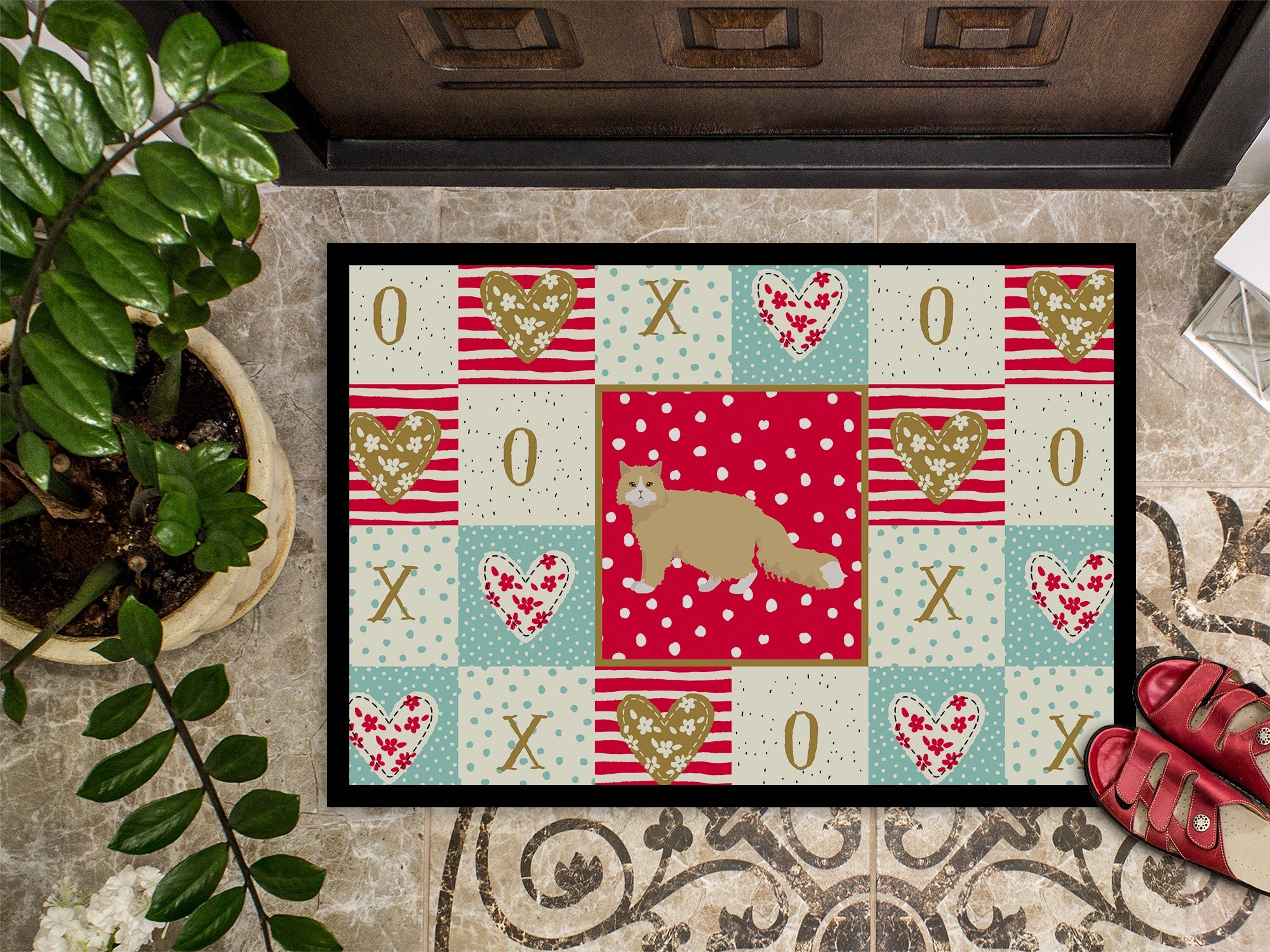 Decorate your space with our Valentine's Day Oregon Rex artwork on a Doormat. Welcome your guests in style with our Artwork Door Mat, designed to withstand almost any weather condition. This mat, measuring approximately 18 by 27 inches, is held together by durable black binding tape. Its top layer, composed of polyester felt, is dyed with the eye-catching image you see on the mat. A few layers below provide the mat with stability, while its rubber bottom is stamped to help prevent slipping and ensures safety. Our mat works wonderfully as both an indoor or outdoor door mat. For cleaning, simply hose it off with water or use a power washer - no need for any cleaner that produces suds. Avoid scrubbing with a brush, instead, opt for the vacuum on floor setting. Designed manufactured and printed in the USA, this mat is a perfect addition to your porch, outdoor kitchen, entryway, or any indoor space. Its unique design makes it a charming decorative rug that greets your guests and adds a stylish touch to your home decor.