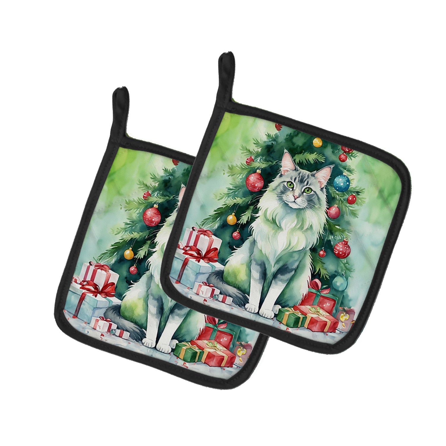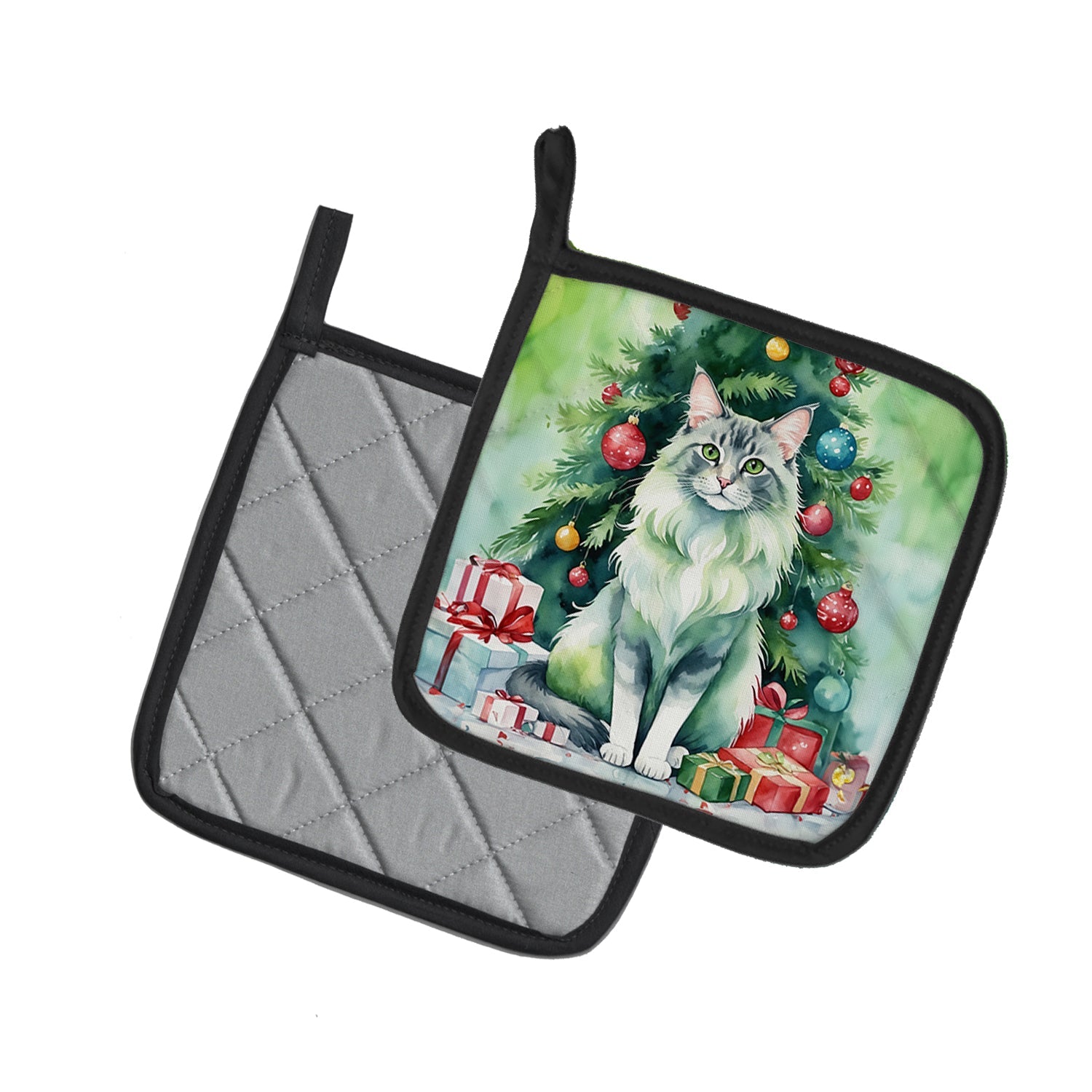 Oriental Longhair Cat By the Christmas Tree Pot Holders - Set of 2 Decorative Kitchen Helpers | Made in the USA