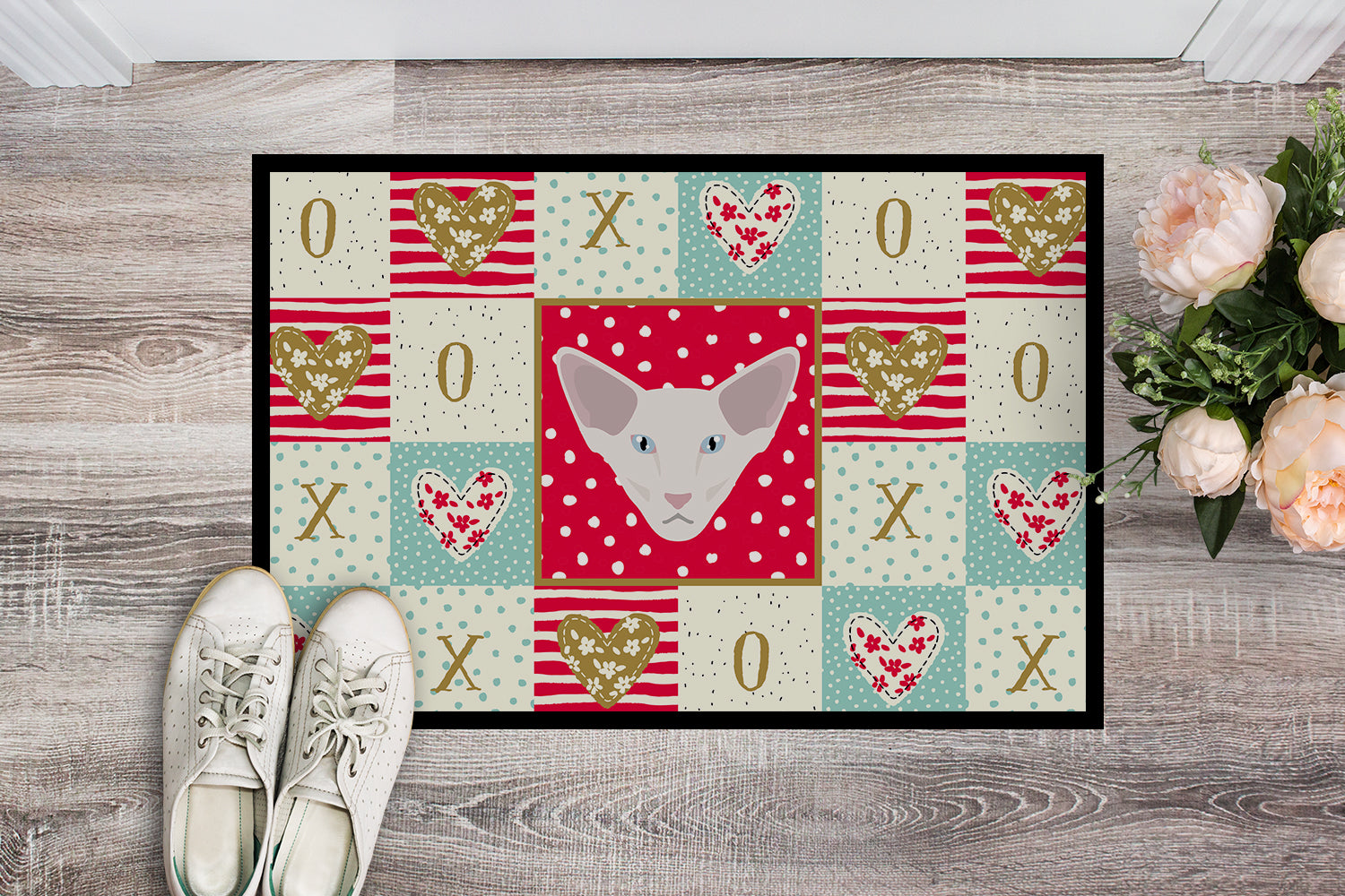 Decorate your space with our Valentine's Day Oriental Longhair artwork on a Doormat. Welcome your guests in style with our Artwork Door Mat, designed to withstand almost any weather condition. This mat, measuring approximately 18 by 27 inches, is held together by durable black binding tape. Its top layer, composed of polyester felt, is dyed with the eye-catching image you see on the mat. A few layers below provide the mat with stability, while its rubber bottom is stamped to help prevent slipping and ensures safety. Our mat works wonderfully as both an indoor or outdoor door mat. For cleaning, simply hose it off with water or use a power washer - no need for any cleaner that produces suds. Avoid scrubbing with a brush, instead, opt for the vacuum on floor setting. Designed manufactured and printed in the USA, this mat is a perfect addition to your porch, outdoor kitchen, entryway, or any indoor space. Its unique design makes it a charming decorative rug that greets your guests and adds a stylish touch to your home decor.