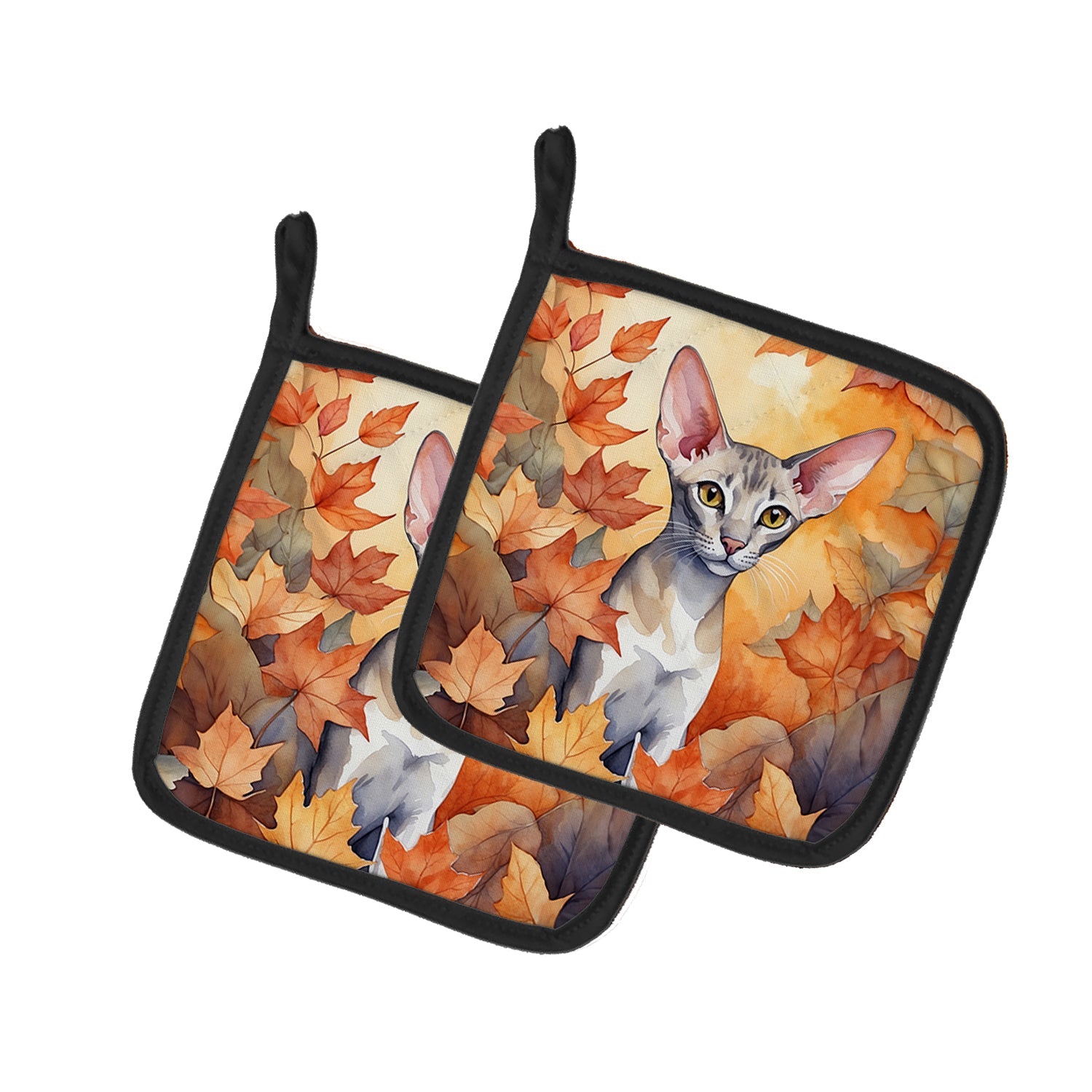 Pair of Pot Holders featuring breed specific Oriental Shorthair artwork. A Pair of Pot Holders to match your kitchen decor. Made in the USA these are thick and functional. Full color artwork decorates the front polyester fabric of the hot pad and accented by a black trim. Use these at as a trivet for your Thanksgiving or Christmas tablescape. Filled with insulated fabric and quilted for durability. These colorful pot holders will make a great gift for your favorite home cook or executive chef. Each pot holder measures approximately 7 1/2 inches by 7 1/2 inches. A hanging tab is included.