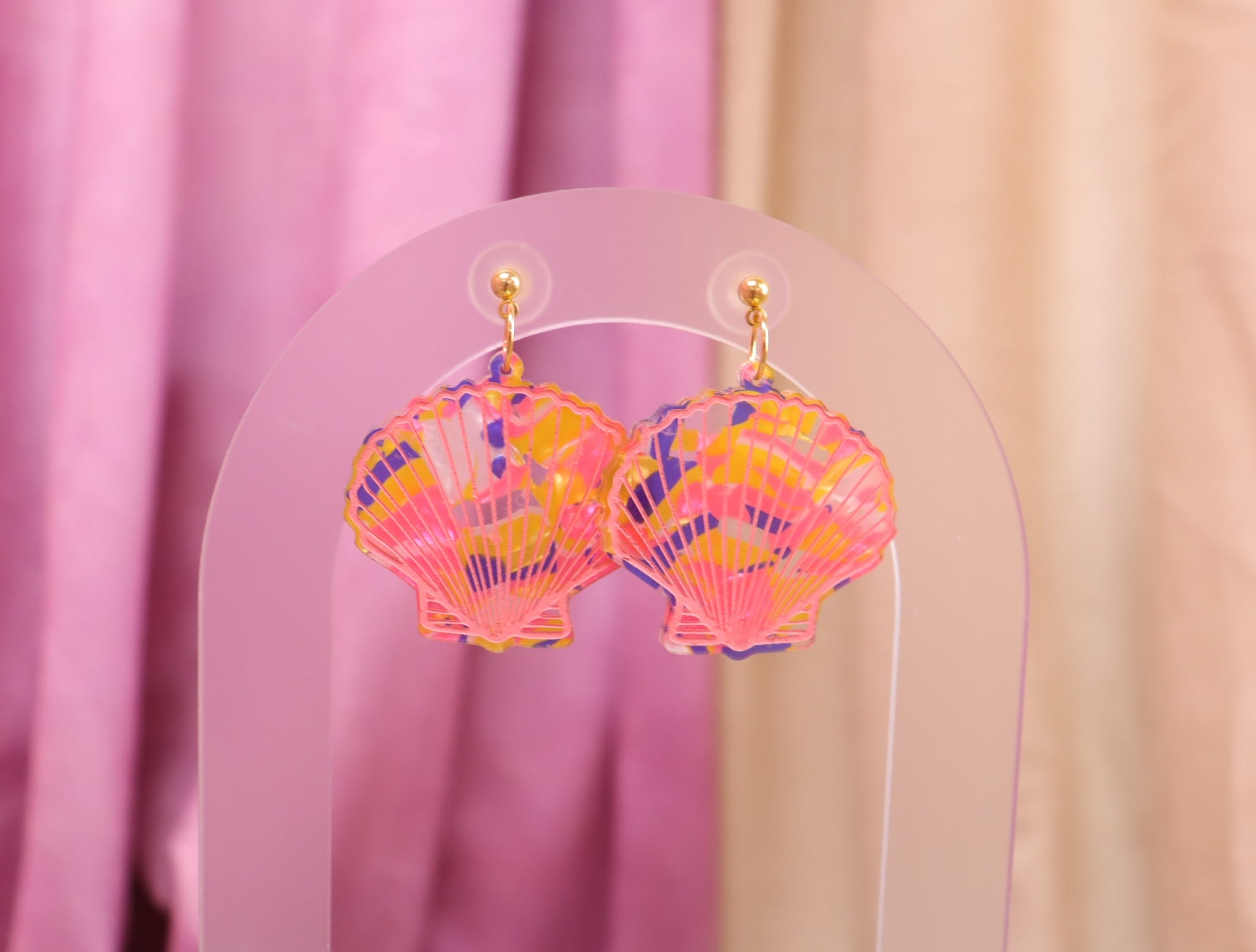Add a vibrant pop of color to your wardrobe with these Painted Scallop Shell Earrings. Crafted from lightweight acrylic, they offer all-day comfort without sacrificing style. Their colorful, hand-painted design brings a playful yet elegant touch, making them the perfect accessory to brighten any outfit.