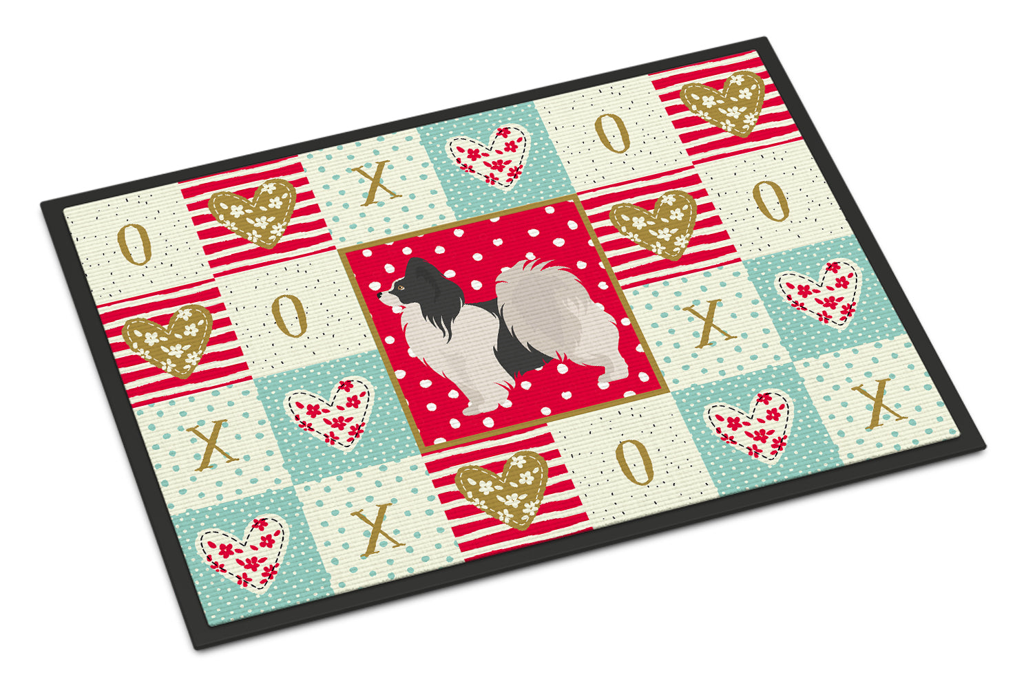 Decorate your space with our Valentine's Day Papillon artwork on a Doormat. Welcome your guests in style with our Artwork Door Mat, designed to withstand almost any weather condition. This mat, measuring approximately 18 by 27 inches, is held together by durable black binding tape. Its top layer, composed of polyester felt, is dyed with the eye-catching image you see on the mat. A few layers below provide the mat with stability, while its rubber bottom is stamped to help prevent slipping and ensures safety. Our mat works wonderfully as both an indoor or outdoor door mat. For cleaning, simply hose it off with water or use a power washer - no need for any cleaner that produces suds. Avoid scrubbing with a brush, instead, opt for the vacuum on floor setting. Designed manufactured and printed in the USA, this mat is a perfect addition to your porch, outdoor kitchen, entryway, or any indoor space. Its unique design makes it a charming decorative rug that greets your guests and adds a stylish touch to your home decor.