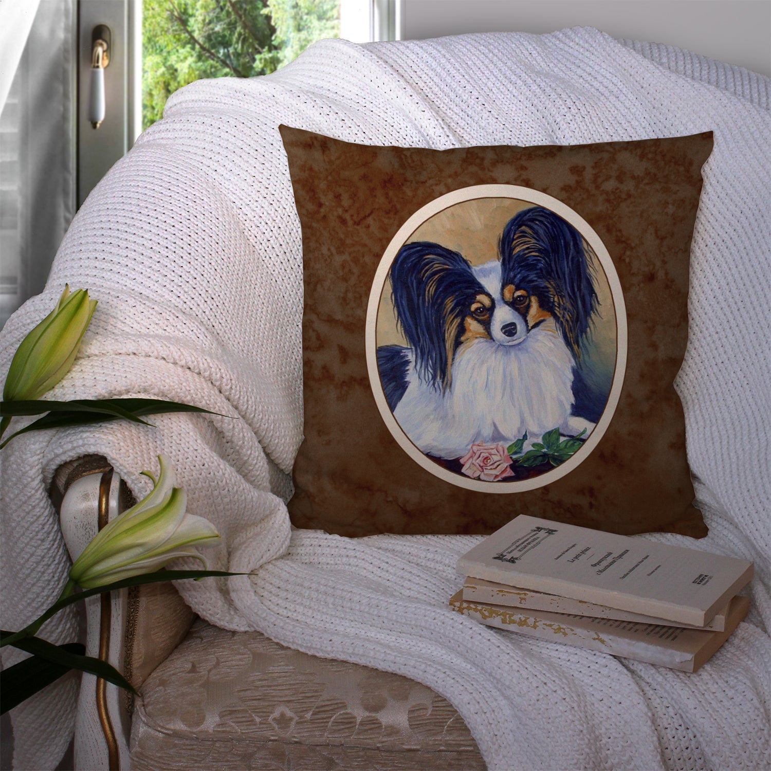 Decorate your space with our Papillon artwork on a Pillow. Add a touch of vibrancy and comfort to your outdoor seating with Caroline's Treasures Fabric Decorative Pillow. Measuring approximately 14 inches by 14 inches, this outdoor pillow is crafted to elevate the appeal of your patio furniture, infusing it with vivid color and artistic flair. The pillow includes a 100% Polyester Fabric sham filled with a quality pillow form to provide superior comfort. Innovatively made from our brand new material, specifically woven for its water resistance, this pillow is designed for durability. The soft canvas fabric offers versatility in use, fit for your indoor couch or your outdoor patio, porch, or veranda. The fabric is dyed with colorfast dyes built for resilience against weather conditions, ensuring the pillow retains its beauty over time. Constructed by sewing three fabric pieces to create a sham, the polyester insert is then nestled inside to form the pillow, resulting in an overstuffed pillow that maintains its shape. Both the sham and the pillow insert are proudly made in the United States. As the pillows are handcrafted, there may be minor variations in size, further enhancing their unique charm. Experience comfort in style with Caroline's Treasures Fabric Decorative Pillow.