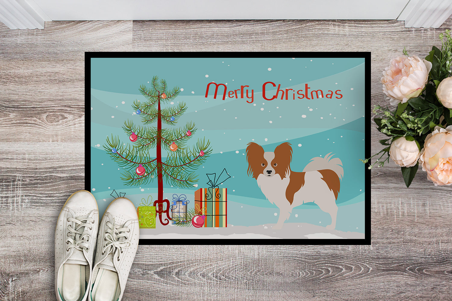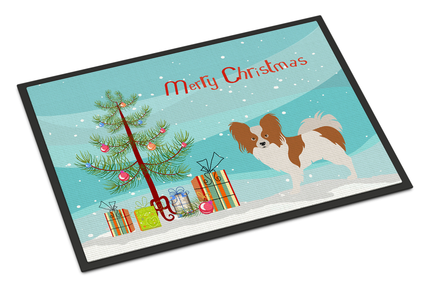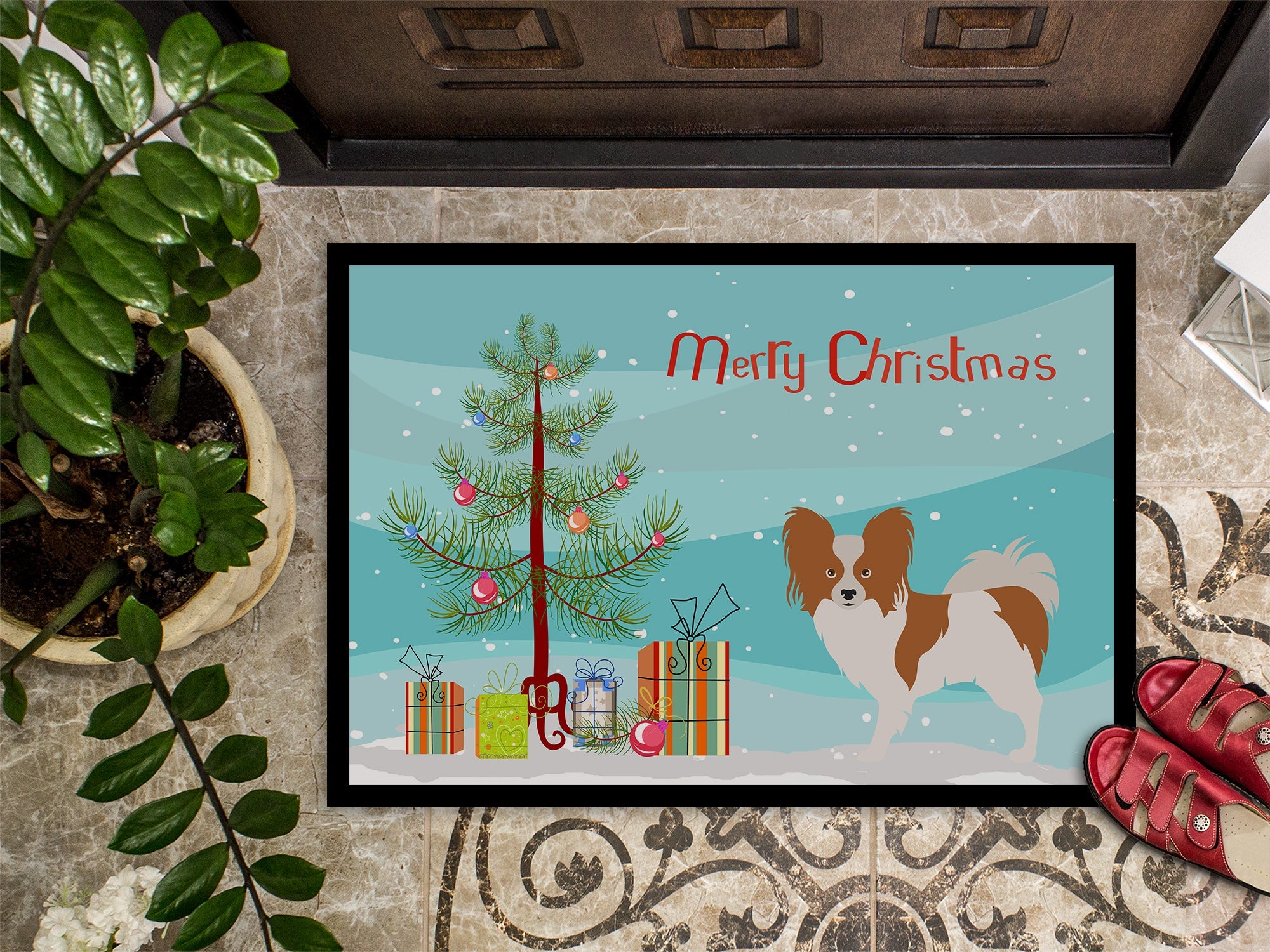 Decorate your space with our Christmas Papillon artwork on a Doormat. Welcome your guests in style with our Artwork Door Mat, designed to withstand almost any weather condition. This mat, measuring approximately 24 by 36 inches, is held together by durable black binding tape. Its top layer, composed of polyester felt, is dyed with the eye-catching image you see on the mat. A few layers below provide the mat with stability, while its rubber bottom is stamped to help prevent slipping and ensures safety. Our mat works wonderfully as both an indoor or outdoor door mat. For cleaning, simply hose it off with water or use a power washer - no need for any cleaner that produces suds. Avoid scrubbing with a brush, instead, opt for the vacuum on floor setting. Designed manufactured and printed in the USA, this mat is a perfect addition to your porch, outdoor kitchen, entryway, or any indoor space. Its unique design makes it a charming decorative rug that greets your guests and adds a stylish touch to your home decor.
