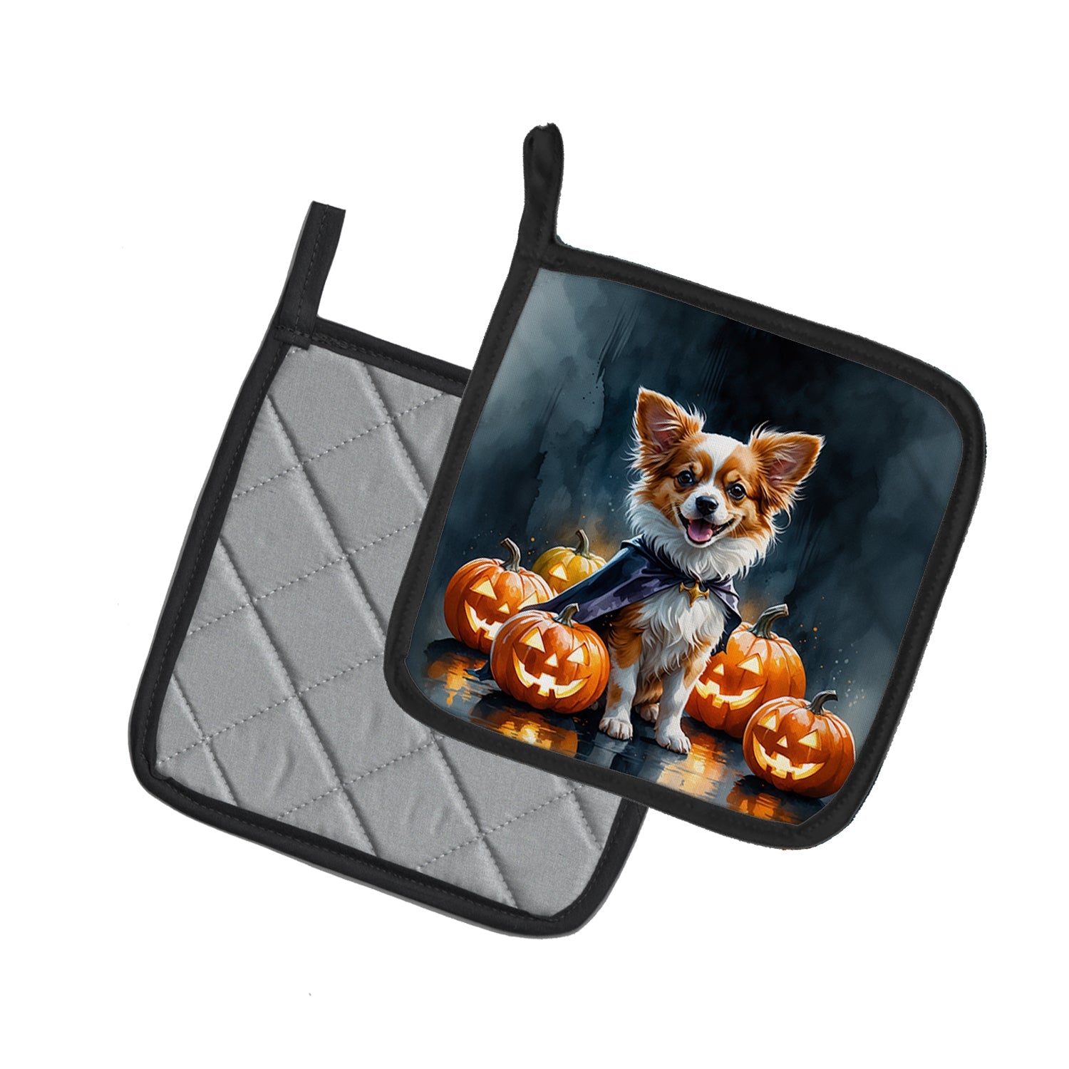 Pair of Pot Holders featuring breed specific Papillon artwork. Celebrate Halloween with this Halloween Pair of Pot Holders. A Pair of Pot Holders to match your kitchen decor. Made in the USA these are thick and functional. Full color artwork decorates the front polyester fabric of the hot pad and accented by a black trim. Use these at as a trivet for your Thanksgiving or Christmas tablescape. Filled with insulated fabric and quilted for durability. These colorful pot holders will make a great gift for your favorite home cook or executive chef. Each pot holder measures approximately 7 1/2 inches by 7 1/2 inches. A hanging tab is included.
