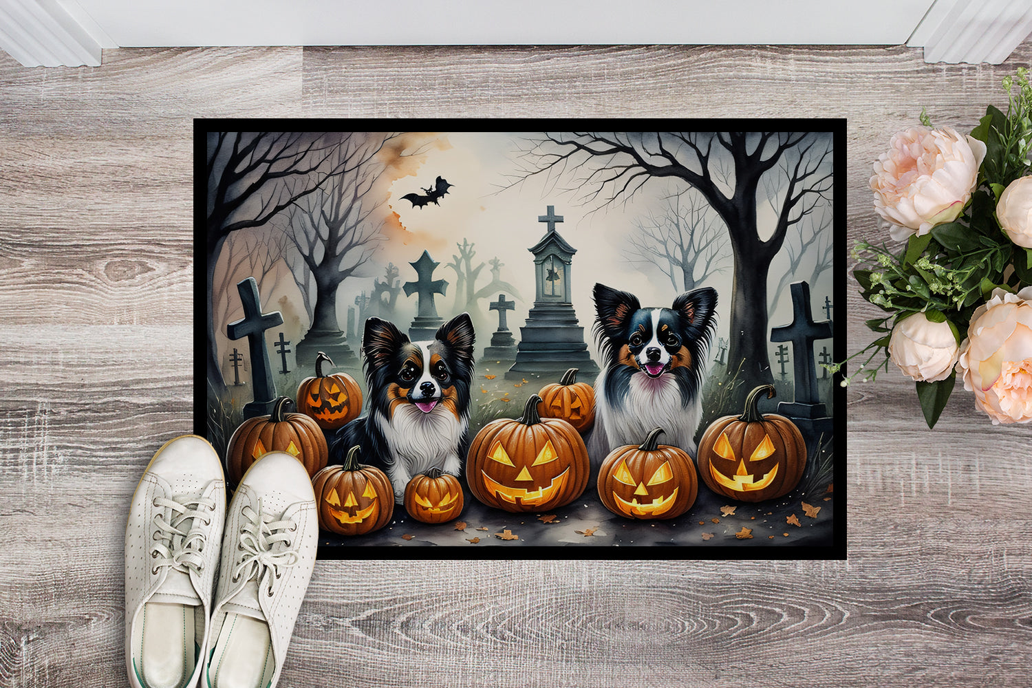 Decorate your space with our Halloween Papillon artwork on a Doormat. Welcome your guests in style with our Artwork Door Mat, designed to withstand almost any weather condition. This mat, measuring approximately 24 by 36 inches, is held together by durable black binding tape. Its top layer, composed of polyester felt, is dyed with the eye-catching image you see on the mat. A few layers below provide the mat with stability, while its rubber bottom is stamped to help prevent slipping and ensures safety. Our mat works wonderfully as both an indoor or outdoor door mat. For cleaning, simply hose it off with water or use a power washer - no need for any cleaner that produces suds. Avoid scrubbing with a brush, instead, opt for the vacuum on floor setting. Designed manufactured and printed in the USA, this mat is a perfect addition to your porch, outdoor kitchen, entryway, or any indoor space. Its unique design makes it a charming decorative rug that greets your guests and adds a stylish touch to your home decor.