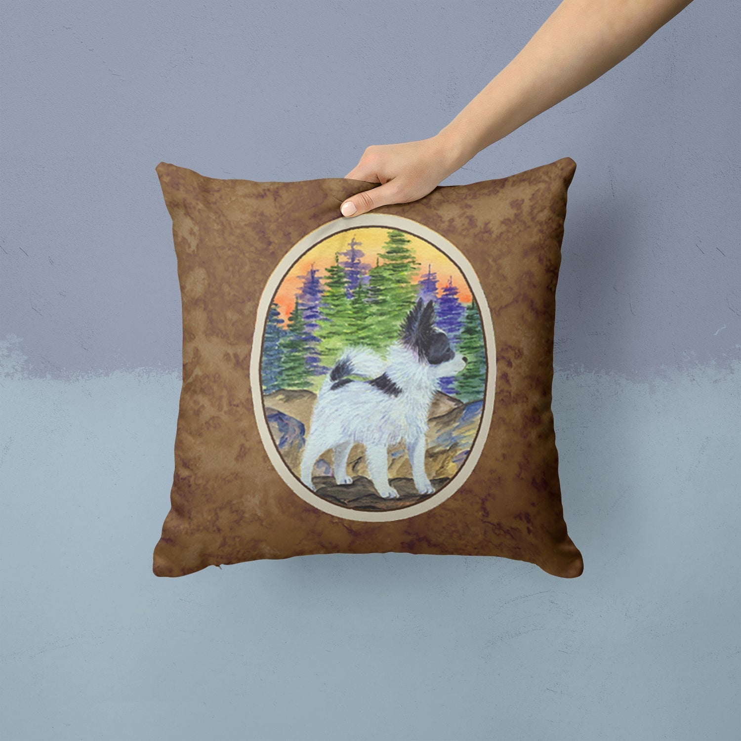 Decorate your space with our Papillon artwork on a Pillow. Add a touch of vibrancy and comfort to your outdoor seating with Caroline's Treasures Fabric Decorative Pillow. Measuring approximately 14 inches by 14 inches, this outdoor pillow is crafted to elevate the appeal of your patio furniture, infusing it with vivid color and artistic flair. The pillow includes a 100% Polyester Fabric sham filled with a quality pillow form to provide superior comfort. Innovatively made from our brand new material, specifically woven for its water resistance, this pillow is designed for durability. The soft canvas fabric offers versatility in use, fit for your indoor couch or your outdoor patio, porch, or veranda. The fabric is dyed with colorfast dyes built for resilience against weather conditions, ensuring the pillow retains its beauty over time. Constructed by sewing three fabric pieces to create a sham, the polyester insert is then nestled inside to form the pillow, resulting in an overstuffed pillow that maintains its shape. Both the sham and the pillow insert are proudly made in the United States. As the pillows are handcrafted, there may be minor variations in size, further enhancing their unique charm. Experience comfort in style with Caroline's Treasures Fabric Decorative Pillow.