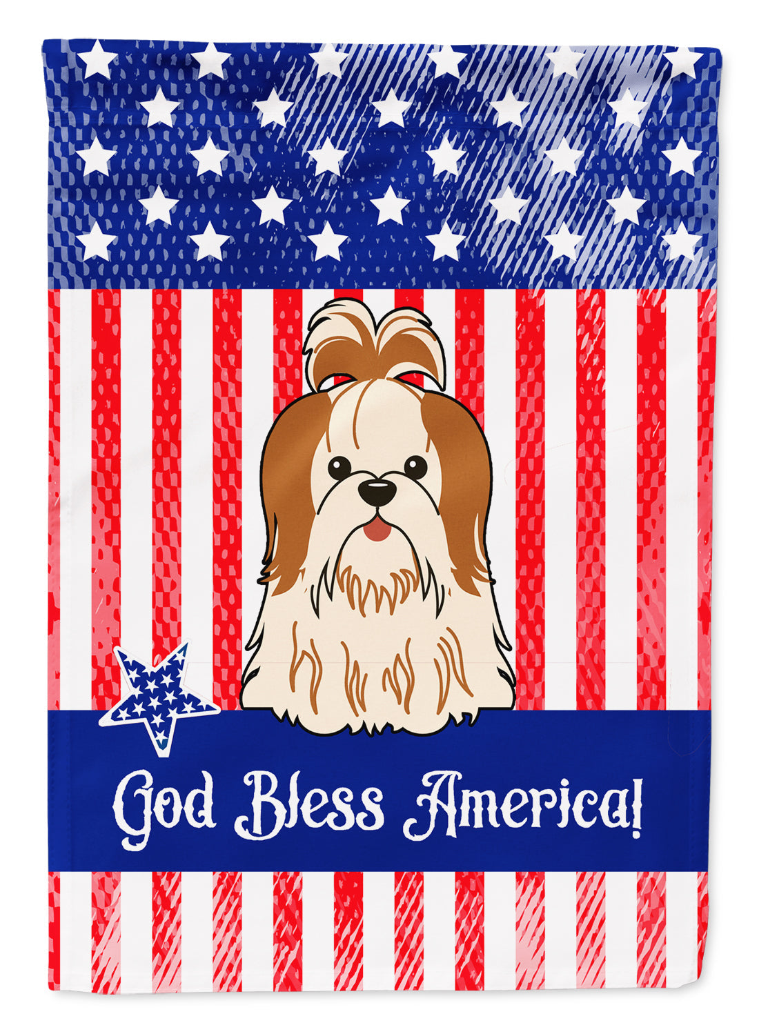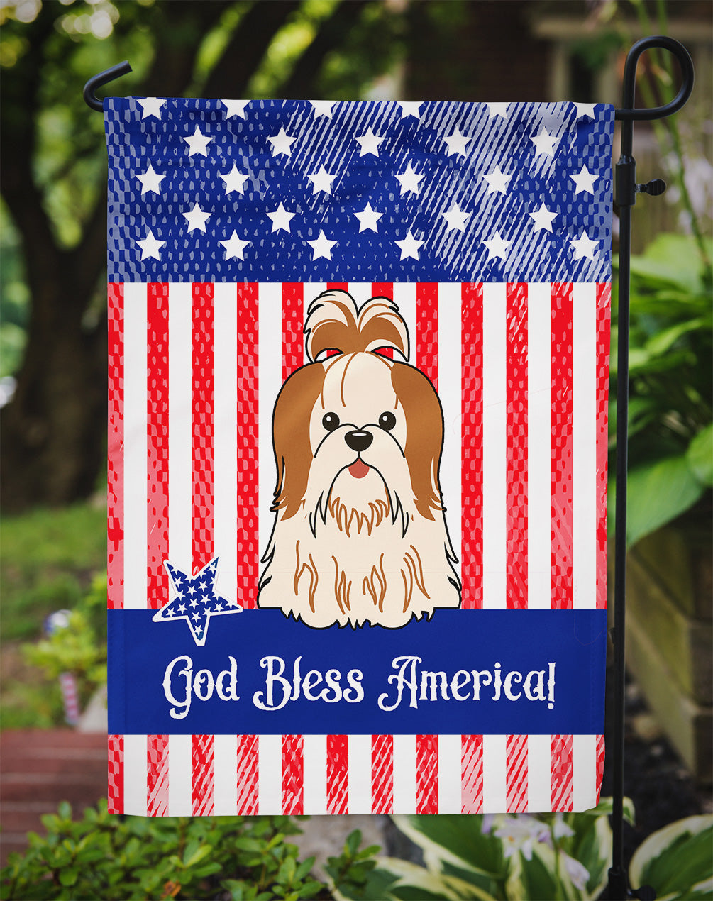 Decorate your space with our Shih Tzu artwork on a Garden Flag. Enhance the beauty of your garden, patio, or yard with Caroline's Treasures Decorative Garden Flag, proudly made in the USA. Crafted from two pieces of thick, double-sided polyester fabric, this 2-ply garden flag is designed to withstand various weather conditions, making it water-resistant and weatherproof. Featuring correctly readable words on both sides, this garden flag offers a delightful visual experience from any angle. With its heavier weight, it stands out among other garden flags, ensuring stability and durability even in wind, rain, and snow. Measuring approximately 11 1/4 inches by 15 1/2 inches, this flag allows you to personalize your outdoor decor. It comes with a 1 1/2-inch sleeve sewn in, allowing easy attachment to any standard garden flag stand or garden size porch hanger (sold separately). Make a statement in your outdoor space with Caroline's Treasures Decorative Garden Flag, a vibrant and high-quality flag that adds color and personality to your surroundings. Proudly made in the USA, it's a symbol of quality craftsmanship and attention to detail.