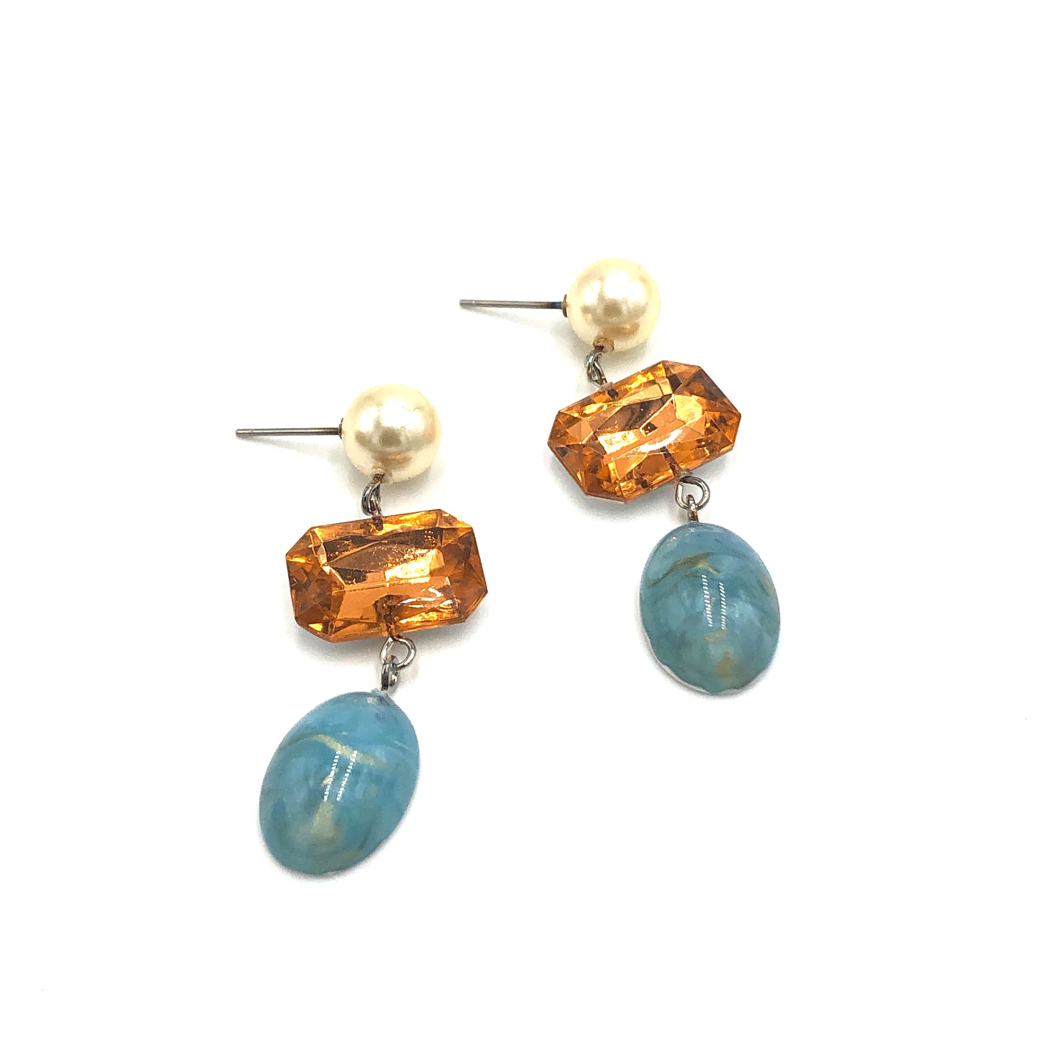Pearl studs meet ice blue and gold in these drop earrings linked with faceted peach rectangle links. Made with '60's & '80's vintage parts & make for a fluid & long statement style. Each earring is set with surgical steel posts & measures just about 2.5" & about 1/2" at the widest point.