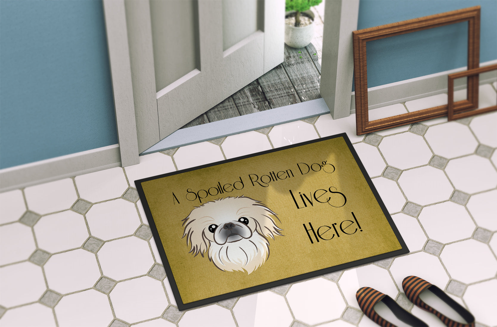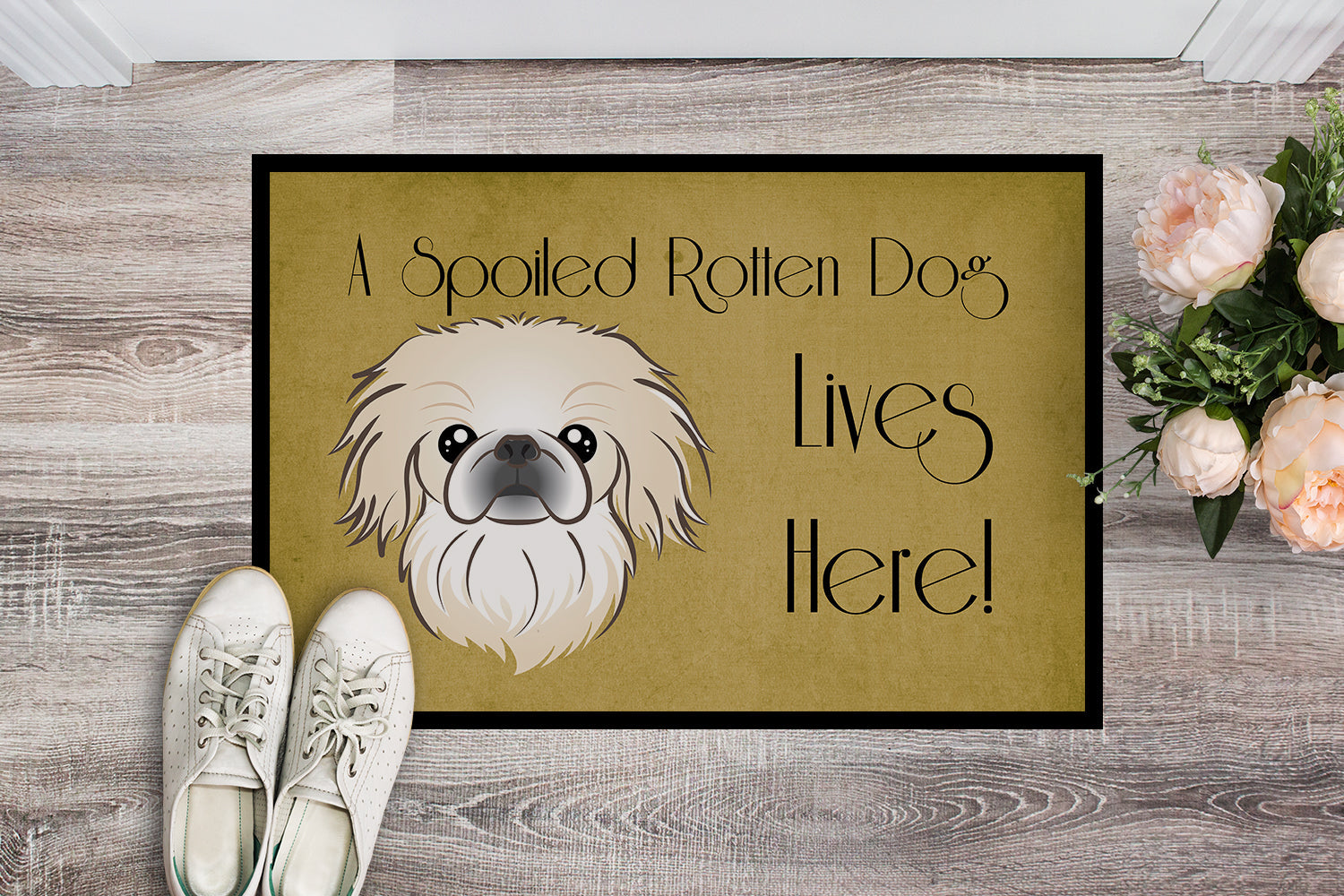 Decorate your space with our Pekingese artwork on a Doormat. Welcome your guests in style with our Artwork Door Mat, designed to withstand almost any weather condition. This mat, measuring approximately 24 by 36 inches, is held together by durable black binding tape. Its top layer, composed of polyester felt, is dyed with the eye-catching image you see on the mat. A few layers below provide the mat with stability, while its rubber bottom is stamped to help prevent slipping and ensures safety. Our mat works wonderfully as both an indoor or outdoor door mat. For cleaning, simply hose it off with water or use a power washer - no need for any cleaner that produces suds. Avoid scrubbing with a brush, instead, opt for the vacuum on floor setting. Designed manufactured and printed in the USA, this mat is a perfect addition to your porch, outdoor kitchen, entryway, or any indoor space. Its unique design makes it a charming decorative rug that greets your guests and adds a stylish touch to your home decor.