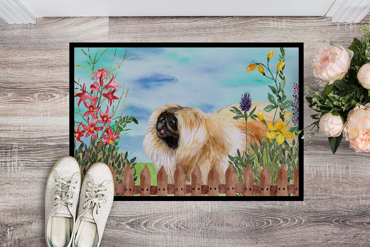 Decorate your space with our Pekingese artwork on a Doormat. Bring a bit of Spring into your home with a Spring Doormat. Welcome your guests in style with our Artwork Door Mat, designed to withstand almost any weather condition. This mat, measuring approximately 18 by 27 inches, is held together by durable black binding tape. Its top layer, composed of polyester felt, is dyed with the eye-catching image you see on the mat. A few layers below provide the mat with stability, while its rubber bottom is stamped to help prevent slipping and ensures safety. Our mat works wonderfully as both an indoor or outdoor door mat. For cleaning, simply hose it off with water or use a power washer - no need for any cleaner that produces suds. Avoid scrubbing with a brush, instead, opt for the vacuum on floor setting. Designed manufactured and printed in the USA, this mat is a perfect addition to your porch, outdoor kitchen, entryway, or any indoor space. Its unique design makes it a charming decorative rug that greets your guests and adds a stylish touch to your home decor.
