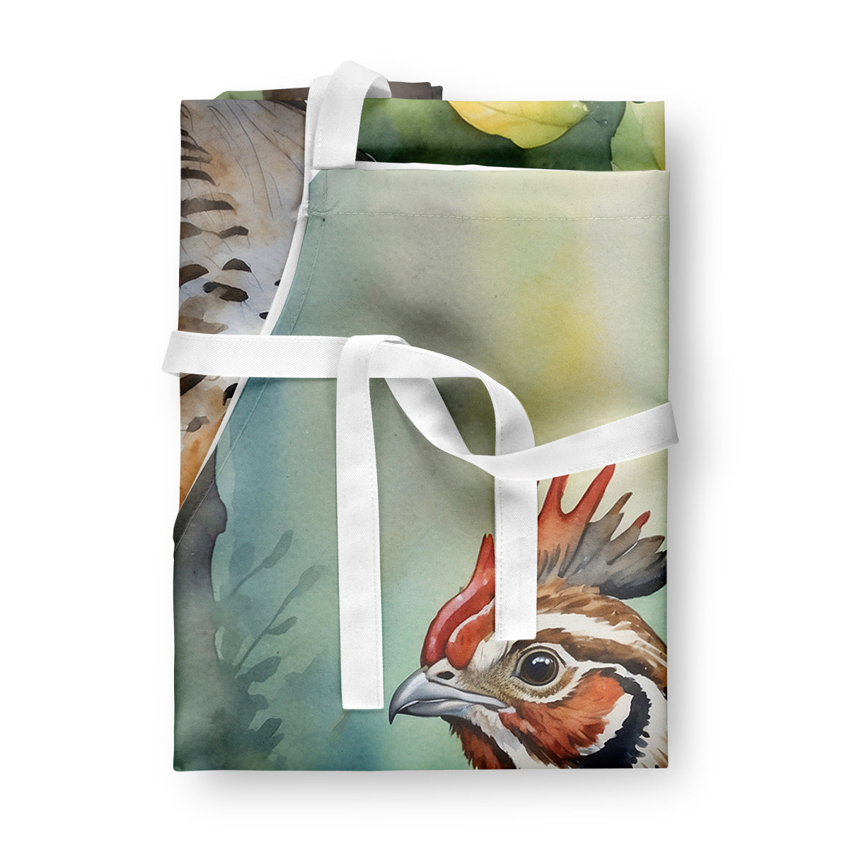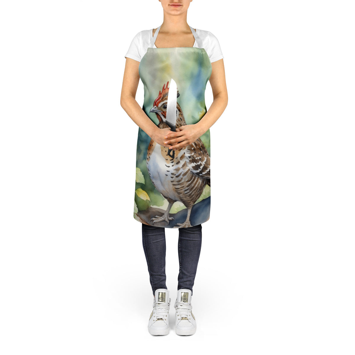Apron featuring breed specific Ruffed Grouse artwork. Elevate your cooking, baking, and grilling experiences with our versatile Kitchen or BBQ Apron. This Bib Style apron isn't just limited to culinary activities - it also serves as an excellent baking apron, artist apron, server apron, gardening apron, or even a dog grooming apron. The apron showcases vibrant full-color artwork contributed by one of our talented artists, bringing a dash of style to your daily tasks. With dimensions of approximately 27"W x 30"H, it provides ample coverage to protect your clothing from spills and splashes. Our apron is meticulously crafted from 100% Ultra Spun Polyester, known for its durability and lightweight nature. The apron comes with white tie straps, ensuring a comfortable and adjustable fit for all. It's a perfect choice for kitchen apron enthusiasts, whether you are a woman or a man. Designed for easy maintenance, this apron is fully machine washable. The quick-drying polyester material actively reduces staining, keeping your apron looking fresh and new for longer. Our beautifully designed apron isn't just a functional kitchen accessory - it's a fashion statement in the culinary world!