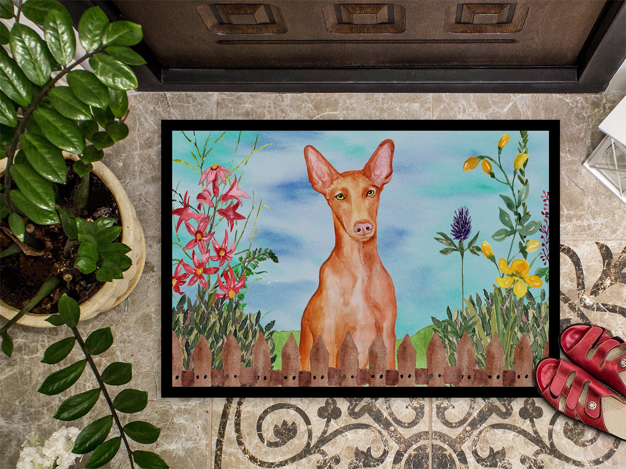 Decorate your space with our Pharaoh Hound artwork on a Doormat. Bring a bit of Spring into your home with a Spring Doormat. Welcome your guests in style with our Artwork Door Mat, designed to withstand almost any weather condition. This mat, measuring approximately 18 by 27 inches, is held together by durable black binding tape. Its top layer, composed of polyester felt, is dyed with the eye-catching image you see on the mat. A few layers below provide the mat with stability, while its rubber bottom is stamped to help prevent slipping and ensures safety. Our mat works wonderfully as both an indoor or outdoor door mat. For cleaning, simply hose it off with water or use a power washer - no need for any cleaner that produces suds. Avoid scrubbing with a brush, instead, opt for the vacuum on floor setting. Designed manufactured and printed in the USA, this mat is a perfect addition to your porch, outdoor kitchen, entryway, or any indoor space. Its unique design makes it a charming decorative rug that greets your guests and adds a stylish touch to your home decor.