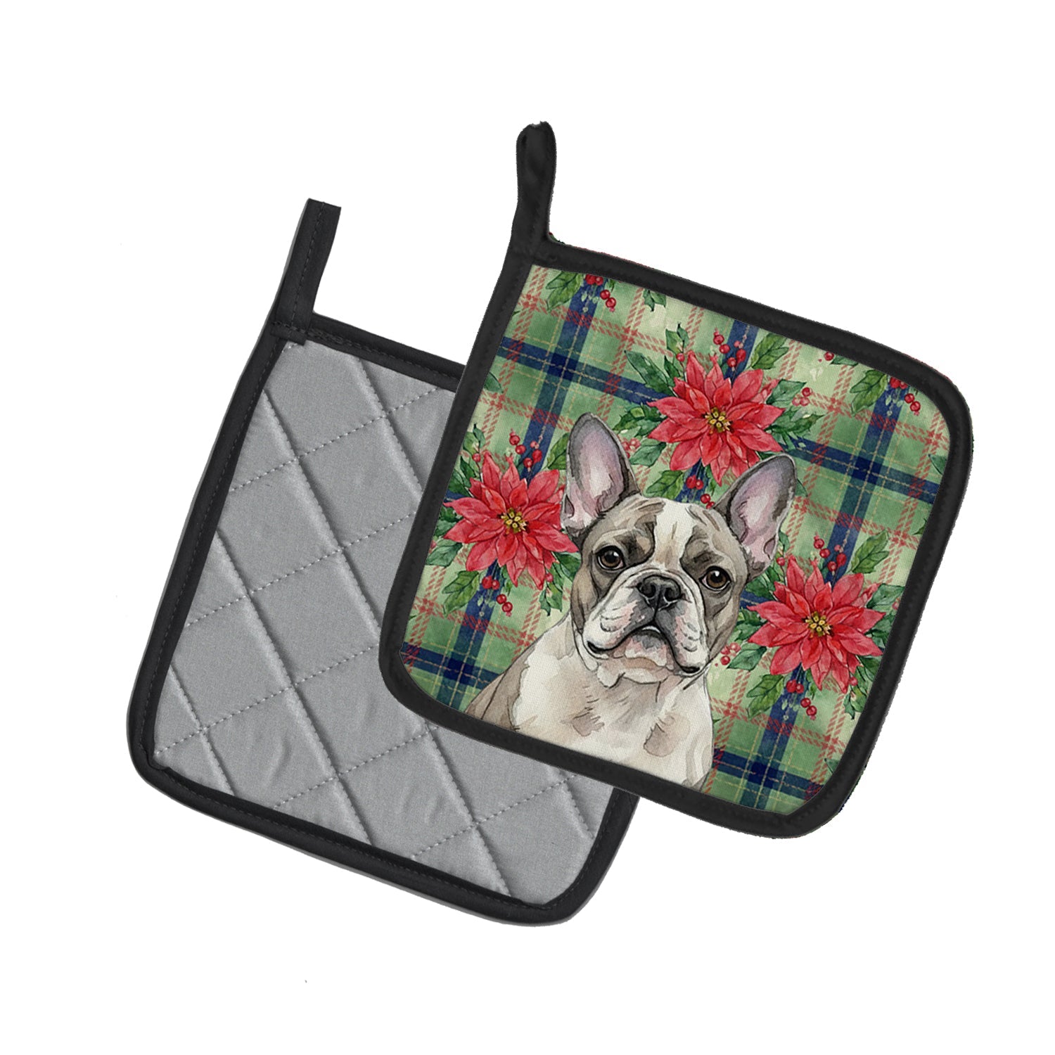 Pair of Pot Holders featuring breed specific French Bulldog artwork. Celebrate Christmas with this Christmas Pair of Pot Holders. Add warmth, personality, and function to your kitchen with our Christmas Poinsettas Pot Holder Pair. Each set includes two quilted hot pads, featuring original full-color watercolor artwork on a soft polyester front accented by black trim. Crafted with multiple layers for performance: Top Layer: Vibrant artwork permanently dyed into polyester fabric. Middle Layer: US-manufactured insulated material with breathable polyester fibers and a reflective metalized film that reflects heat back to its source. Bottom Layer: A silver heat-resistant backing for extra protection. Each pot holder measures 7.5" x 7.5", includes a hanging tab, and is quilted for durability. Use them to protect your hands, countertops, and tabletops — or as decorative trivets for Thanksgiving, Christmas, or everyday meals.