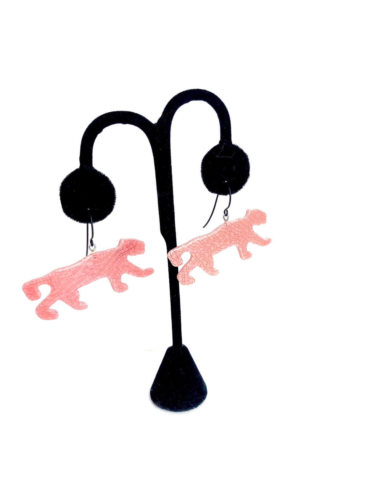 Pink speckled resin vintage wild cat earrings. Tiger, puma, or leopard, these pieces are vintage parts originally made for Lea Stein in France. We handset them into drop earrings - super rare & collectible.