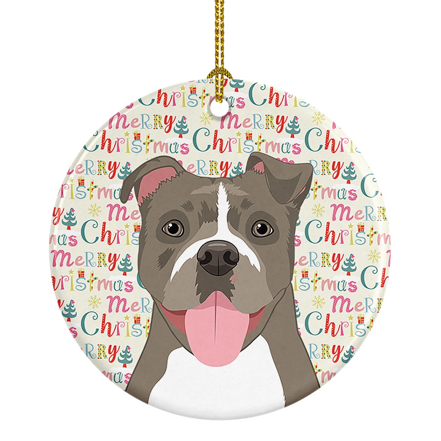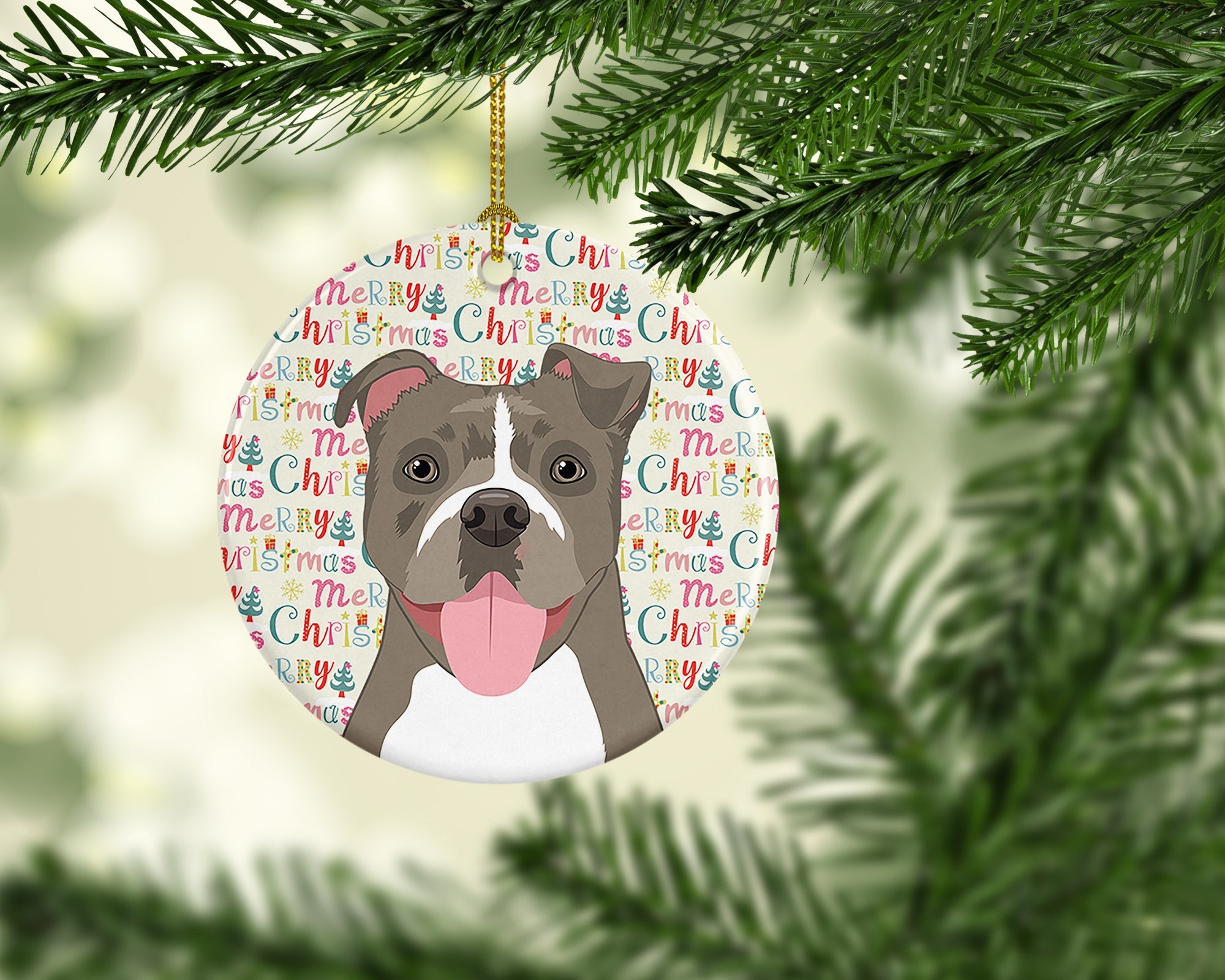 Decorate your space with our Christmas Pit Bull Terrier artwork on a Ornament. Add a touch of personalized charm to your Christmas tree this holiday season with our Ceramic Ornament. Measuring 2.8125 inches in diameter, this round porcelain ornament beautifully reflects your festive lights, enhancing your holiday decor. The gloss surface sets off the vibrant, full-color artwork contributed by one of our talented artists, bringing a pop of color and joy to your tree. This Ceramic Ornament doesn't stop at being merely decorative. The white back is designed for personalization. Write a heartfelt message, mark a special year, or inscribe a date with a paint pen or a permanent marker to create a treasured memento. Please ensure you allow any personalization to dry thoroughly before handling to maintain the pristine finish. Included with the ornament is a delicate gold cord for easy hanging. Made in the USA, this Ceramic Ornament makes an exceptional gift for a pet sitter, teacher, family member, or anyone you wish to share a little Christmas magic with. With its blend of style, charm, and personal touch, it's a meaningful addition to any Christmas tree.