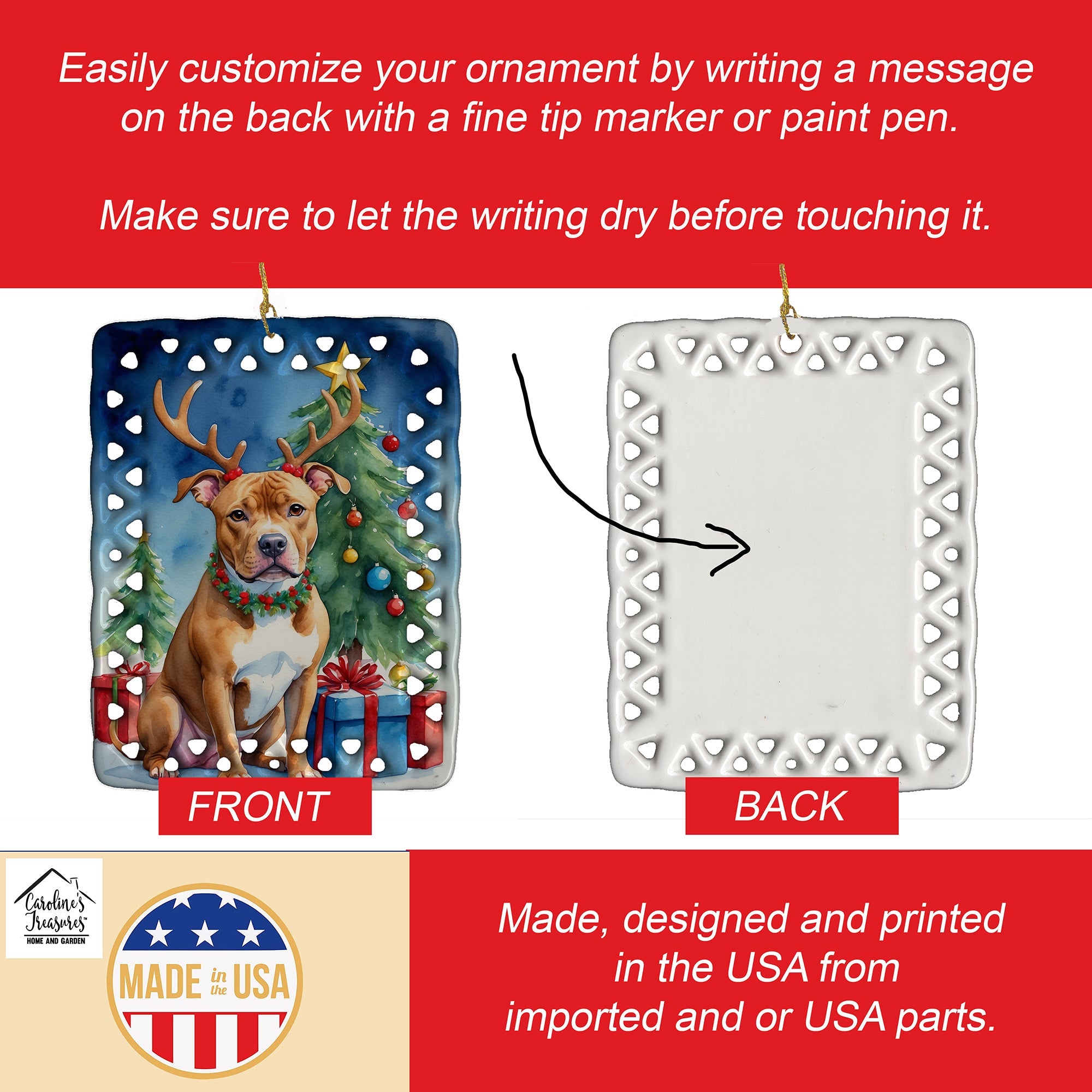 Porcelain Ornament featuring breed specific Pit Bull Terrier artwork. Celebrate Christmas with this Christmas Ornament. Add a unique, personal touch to your holiday decor with our Rectangular Lattice Porcelain Ornament. Perfect for creating cherished memories, this high-quality ornament shines under festive lights, reflecting warmth and joy throughout your Christmas tree. Crafted with a glossy finish, it showcases vibrant, full-color artwork contributed by our talented artists, ensuring your tree is adorned with a burst of color and holiday spirit. What sets this Porcelain Ornament apart is its customizable white back. Use a paint pen or permanent marker to write a heartfelt message, commemorate a special year, or mark an unforgettable date, turning this ornament into a keepsake that will be treasured for years to come. For best results, allow any personalization to dry thoroughly before handling. Each ornament comes complete with a delicate gold cord, making it easy to hang and display. Proudly made in the USA, this ornament measures 3.375 x 2.625 inches and is a thoughtful gift for pet sitters, teachers, family members, or anyone who would appreciate a little extra holiday magic. Bring style, charm, and a touch of personal meaning to your Christmas tree with this beautifully designed ornament..