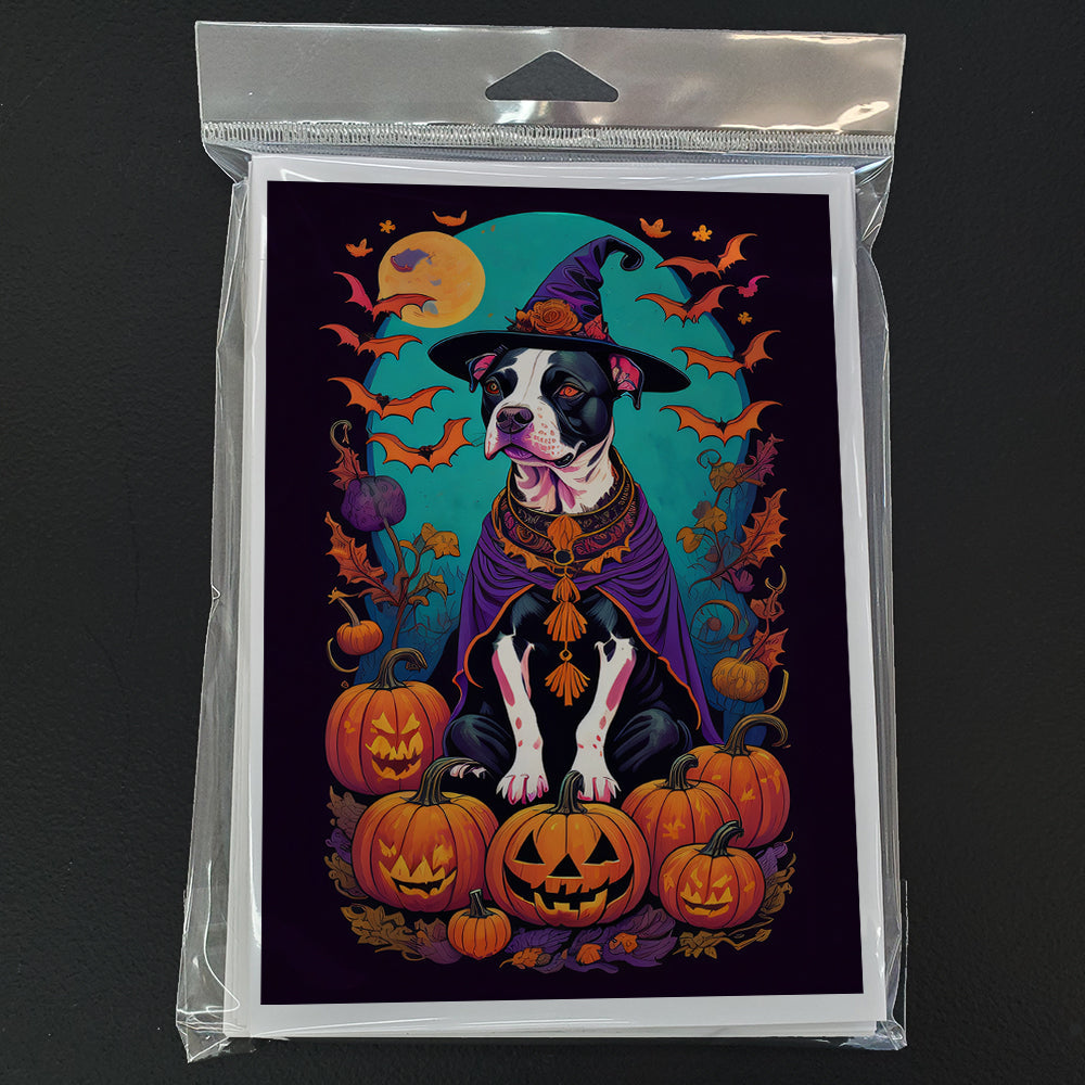Decorate your space with our Halloween Pit Bull Terrier artwork on a . Celebrate special moments with Caroline's Treasures Printed Greeting Card Pack. This pack includes eight beautifully folded 5x7 cards, accompanied by eight matching white envelopes. With blank interiors, these cards provide ample space for your personalized messages and heartfelt holiday greetings. Each card features captivating full-color artwork, meticulously printed in our facility on high-quality 80 lb cover stock or 216 GSM. The super smooth finish of the white cards enhances the visual impact of the artwork, creating a truly stunning presentation. Designed by our talented in-house artists or licensed artists, the artwork on these cards showcases their creativity and attention to detail. From vibrant illustrations to captivating designs, each card tells its own unique story. Whether it's for birthdays, anniversaries, holidays, or any special occasion, Caroline's Treasures Greeting Card Pack is the perfect way to convey your heartfelt sentiments. Share joy, love, and warm wishes with these exquisite cards and make every moment unforgettable.