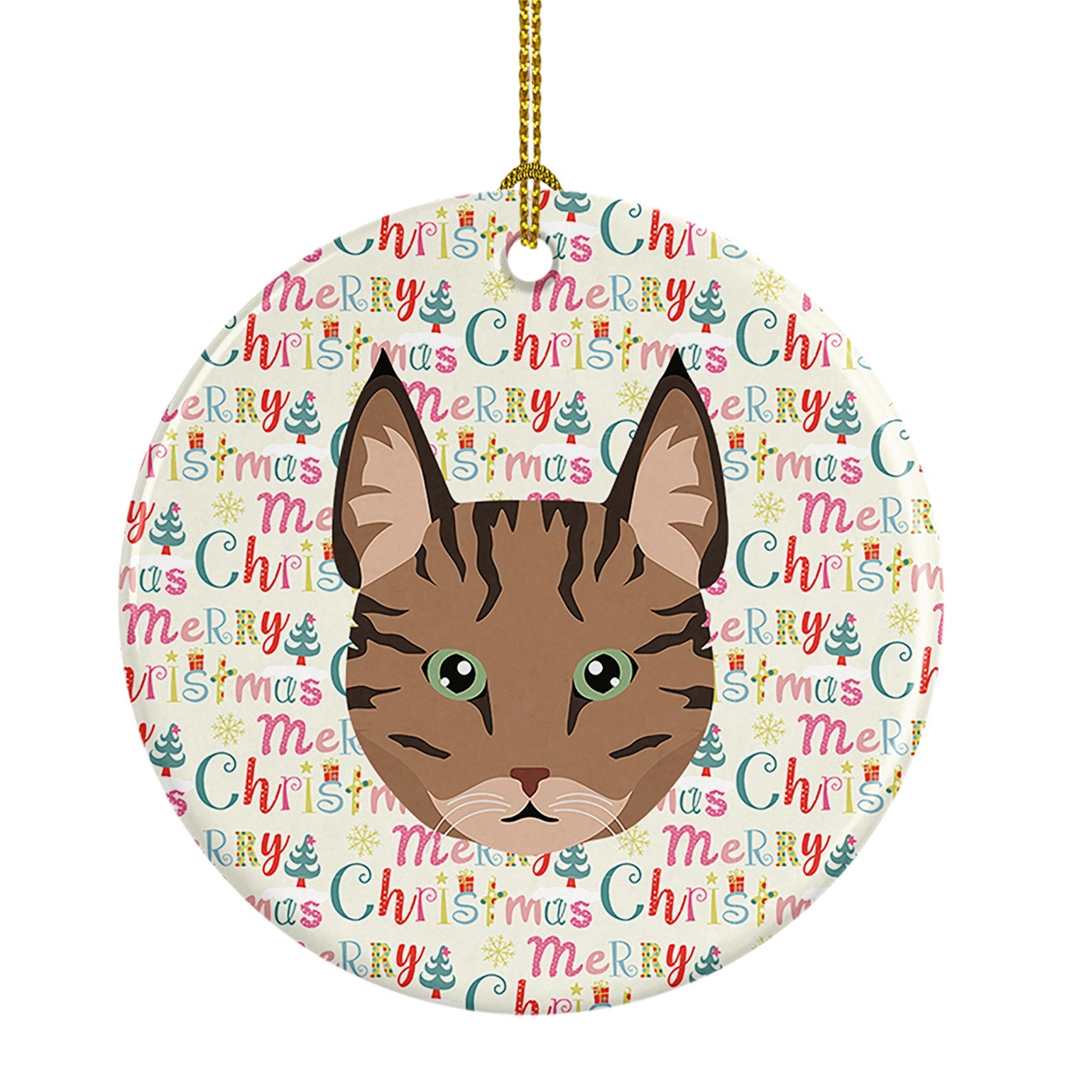 Decorate your space with our Christmas Pixie Bob Cat artwork on a Ornament. Add a touch of personalized charm to your Christmas tree this holiday season with our Ceramic Ornament. Measuring 2.8125 inches in diameter, this round porcelain ornament beautifully reflects your festive lights, enhancing your holiday decor. The gloss surface sets off the vibrant, full-color artwork contributed by one of our talented artists, bringing a pop of color and joy to your tree. This Ceramic Ornament doesn't stop at being merely decorative. The white back is designed for personalization. Write a heartfelt message, mark a special year, or inscribe a date with a paint pen or a permanent marker to create a treasured memento. Please ensure you allow any personalization to dry thoroughly before handling to maintain the pristine finish. Included with the ornament is a delicate gold cord for easy hanging. Made in the USA, this Ceramic Ornament makes an exceptional gift for a pet sitter, teacher, family member, or anyone you wish to share a little Christmas magic with. With its blend of style, charm, and personal touch, it's a meaningful addition to any Christmas tree.