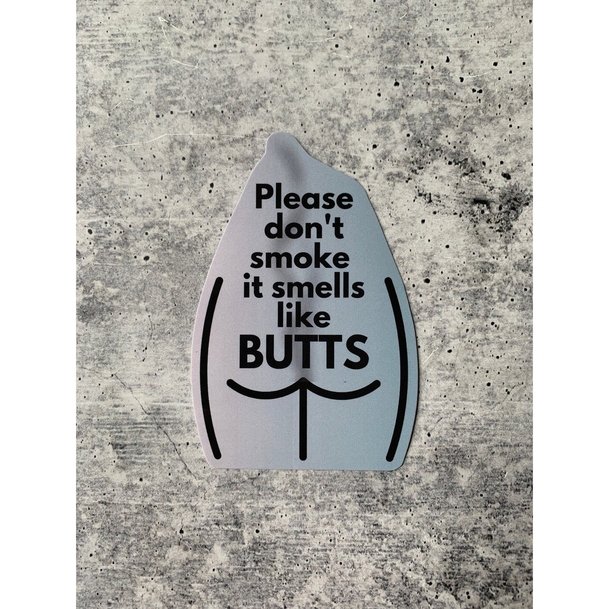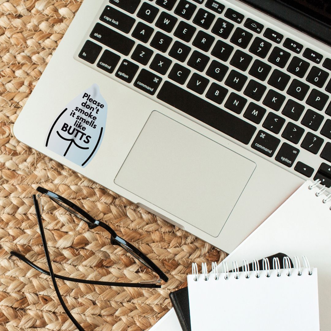 Add some humor and attitude to your laptop with the "Please Don't Smoke It Smells Like Butts" die-cut vinyl sticker. This 3.54" x 2.36" sticker is perfect for adding a touch of sass to your water bottle, bike, or any other smooth surface. It makes a fun and unique gift for the sarcastic friend in your life.