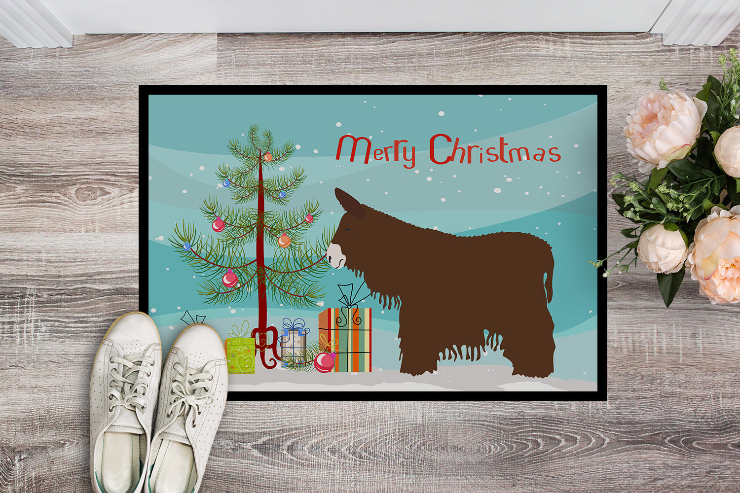 Decorate your space with our Christmas Poitou Poiteuin Donkey artwork on a Doormat. Welcome your guests in style with our Artwork Door Mat, designed to withstand almost any weather condition. This mat, measuring approximately 24 by 36 inches, is held together by durable black binding tape. Its top layer, composed of polyester felt, is dyed with the eye-catching image you see on the mat. A few layers below provide the mat with stability, while its rubber bottom is stamped to help prevent slipping and ensures safety. Our mat works wonderfully as both an indoor or outdoor door mat. For cleaning, simply hose it off with water or use a power washer - no need for any cleaner that produces suds. Avoid scrubbing with a brush, instead, opt for the vacuum on floor setting. Designed manufactured and printed in the USA, this mat is a perfect addition to your porch, outdoor kitchen, entryway, or any indoor space. Its unique design makes it a charming decorative rug that greets your guests and adds a stylish touch to your home decor.