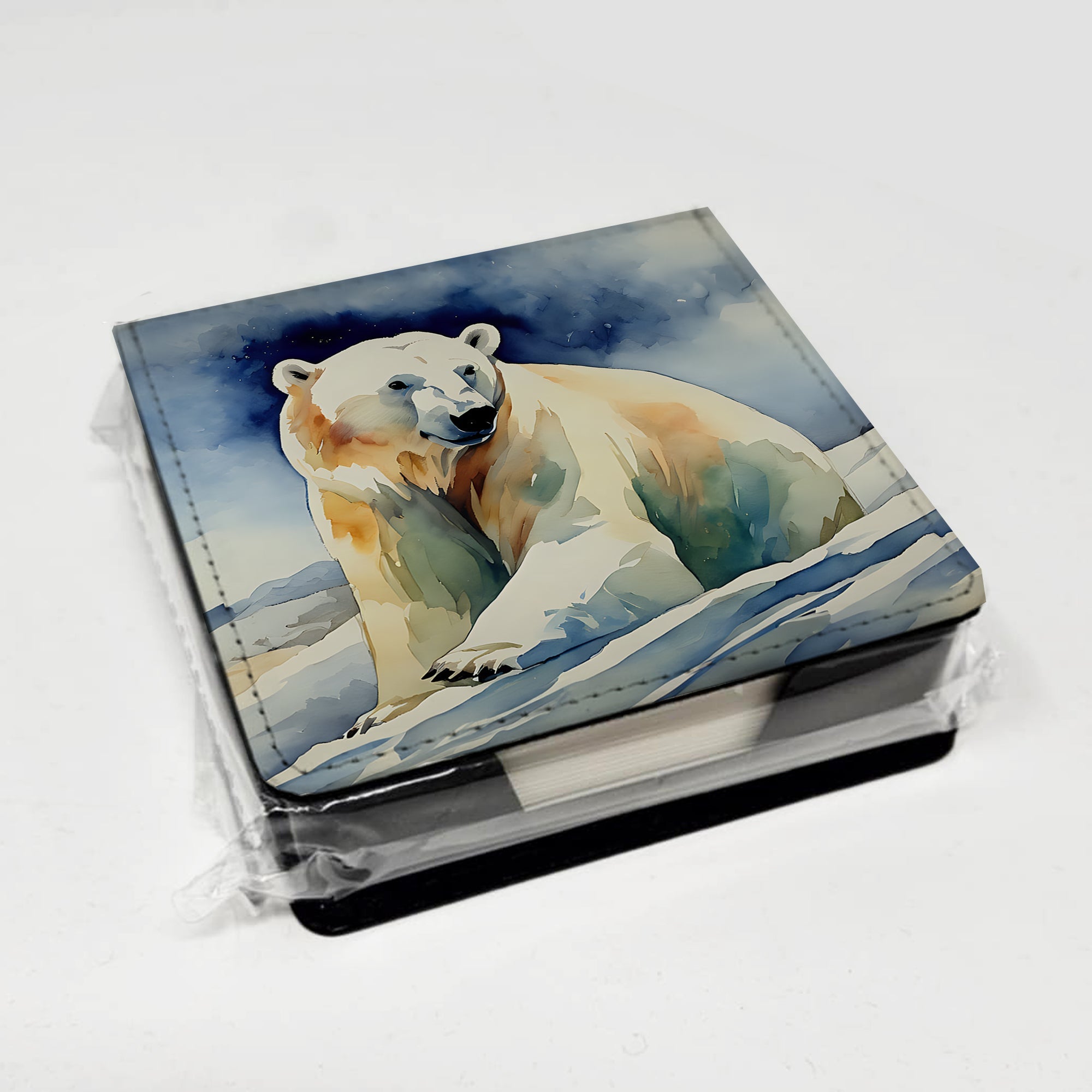 PU Leather Note Paper Holder featuring breed specific Polar Bear artwork. Elevate your workspace with this PU Leather Note Paper Holder, crafted to resemble luxurious leather without the use of animal products. Made from durable synthetic PU leather, it offers both a premium look and eco-friendly appeal. This note holder, compactly sized at 4.25 x 4.25 x 1.25 inches, includes about 160 sheets of 3.75 x 3.75-inch note paper—ideal for quick notes and reminders. An exclusive artist-designed cover makes each holder uniquely vibrant, adding a splash of color and personality to any desk or office. The discrete design keeps note paper hidden, maintaining a neat and organized workspace. Perfect as a gift or for personal use, this stylish holder is refillable with standard paper, ensuring long-lasting utility. A must-have for anyone seeking a sophisticated, artful touch to their workspace while supporting animal-friendly products. Add style, organization, and creativity to your everyday routine with this elegant note paper holder.